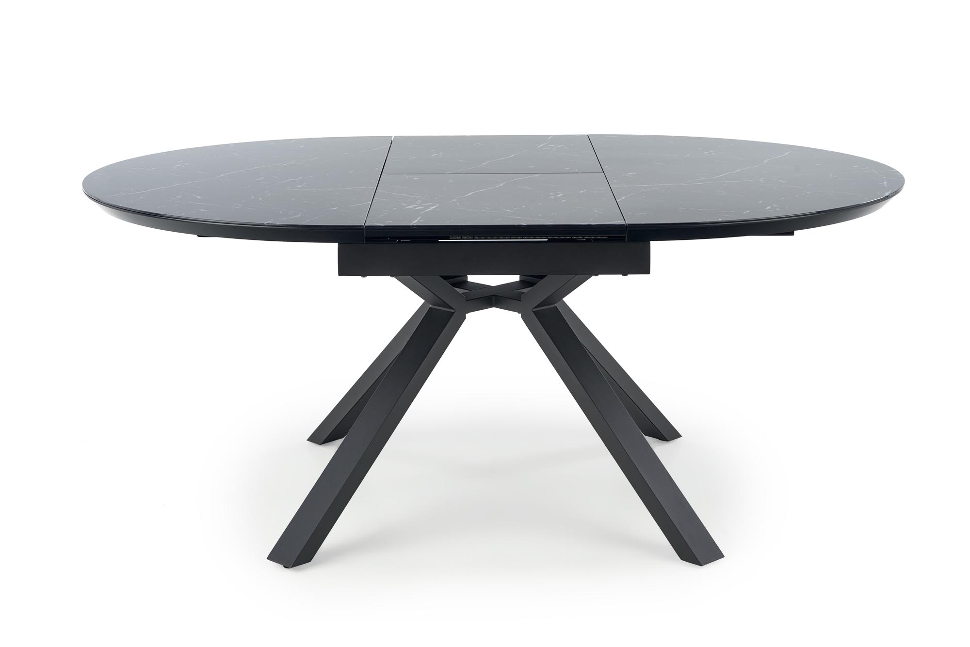 stół rozkładany, wymiary: 130-180/130/76 cm, materiał: szkło / MDF lakierowany / stal malowana proszkowo, kolor: blat – czarny marmur, nogi – czarny