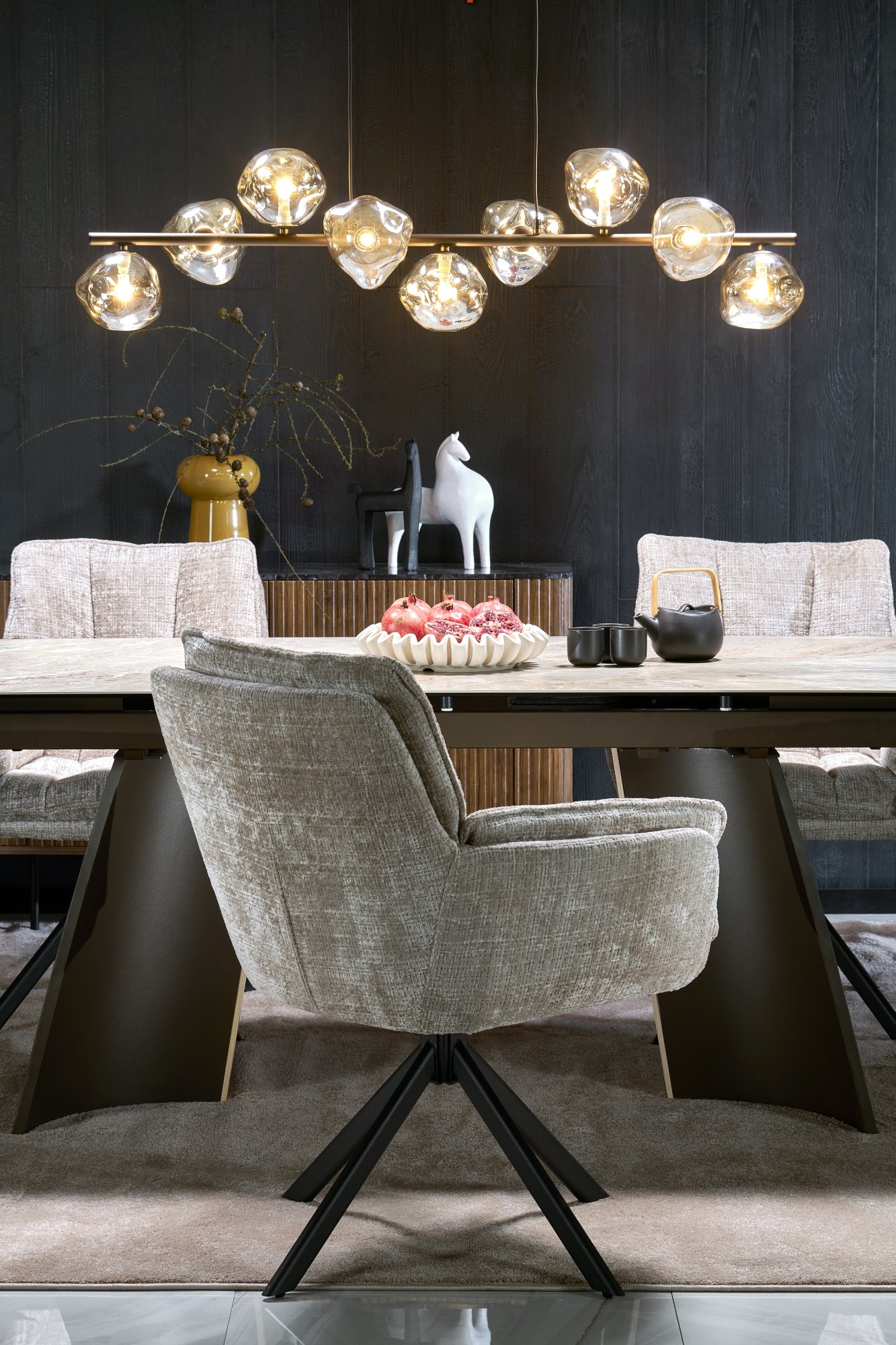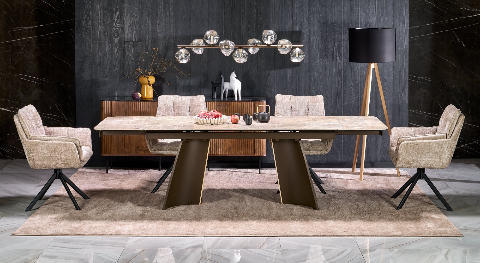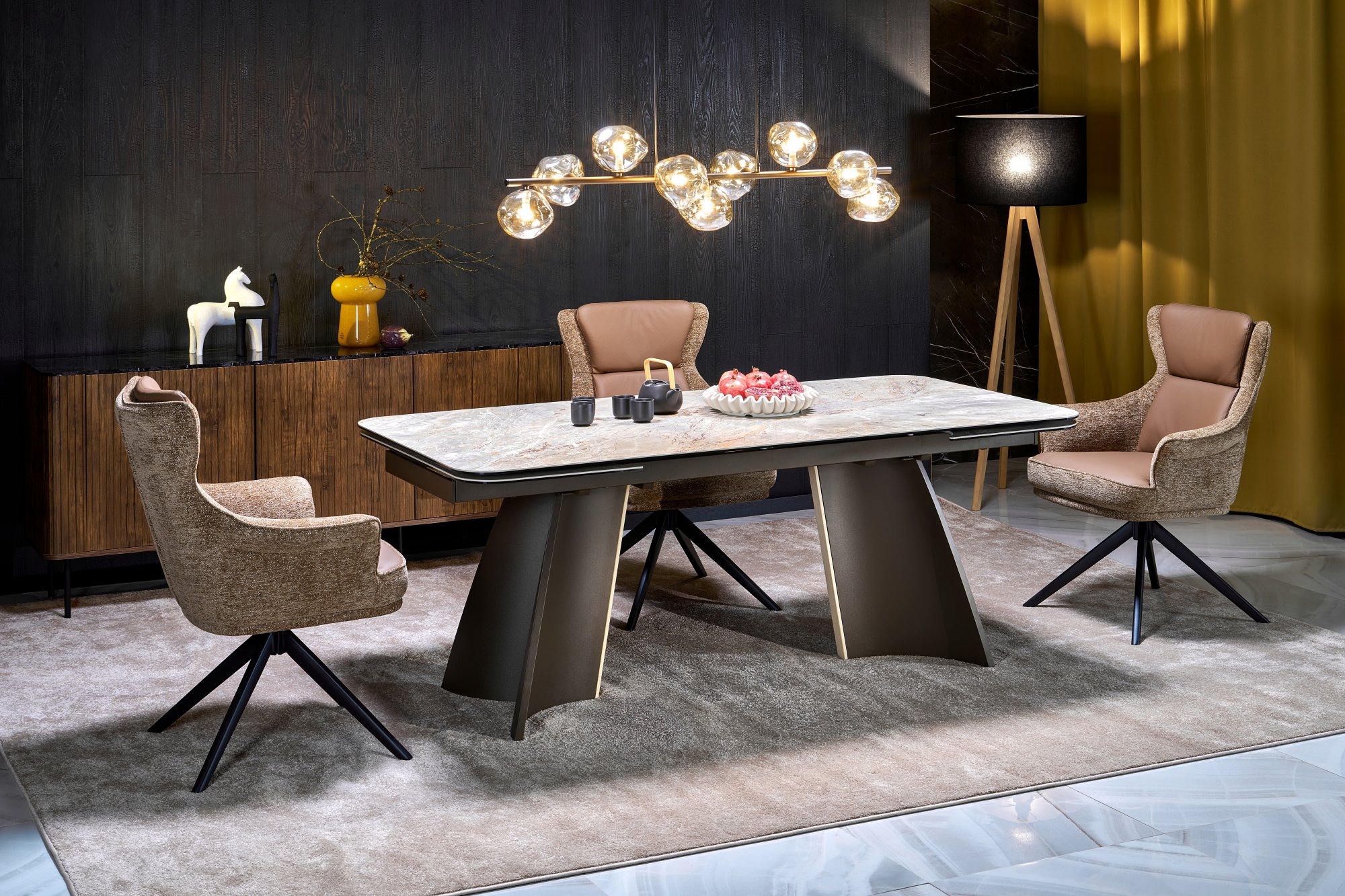 wymiary: 180-260/90/76 cm, stół rozkładany, materiał: ceramika / szkło / stal malowana proszkowo / drewno lite, kolor: blat – beżowy marmur, noga – brązowy