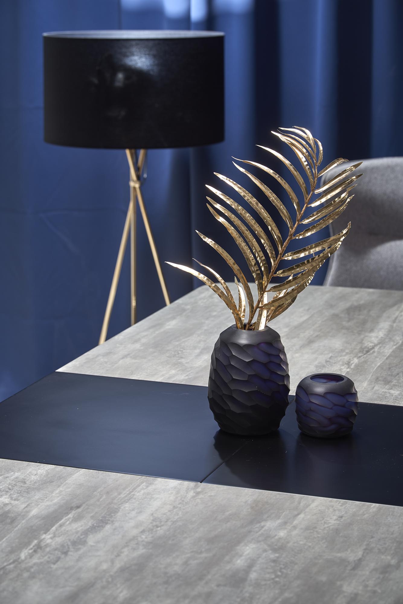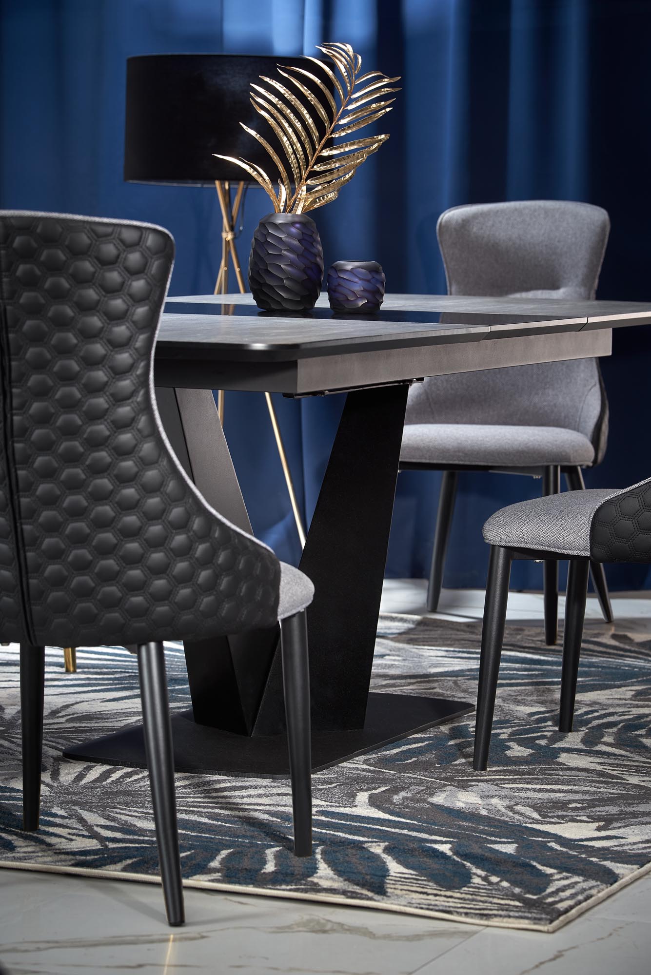 stół rozkładany, wymiary: 180-230/95/76 cm, materiał: MDF lakierowany + płyta HPL / stal malowana proszkowo, kolor: blat – ciemny popiel / czarny, nogi – czarny
