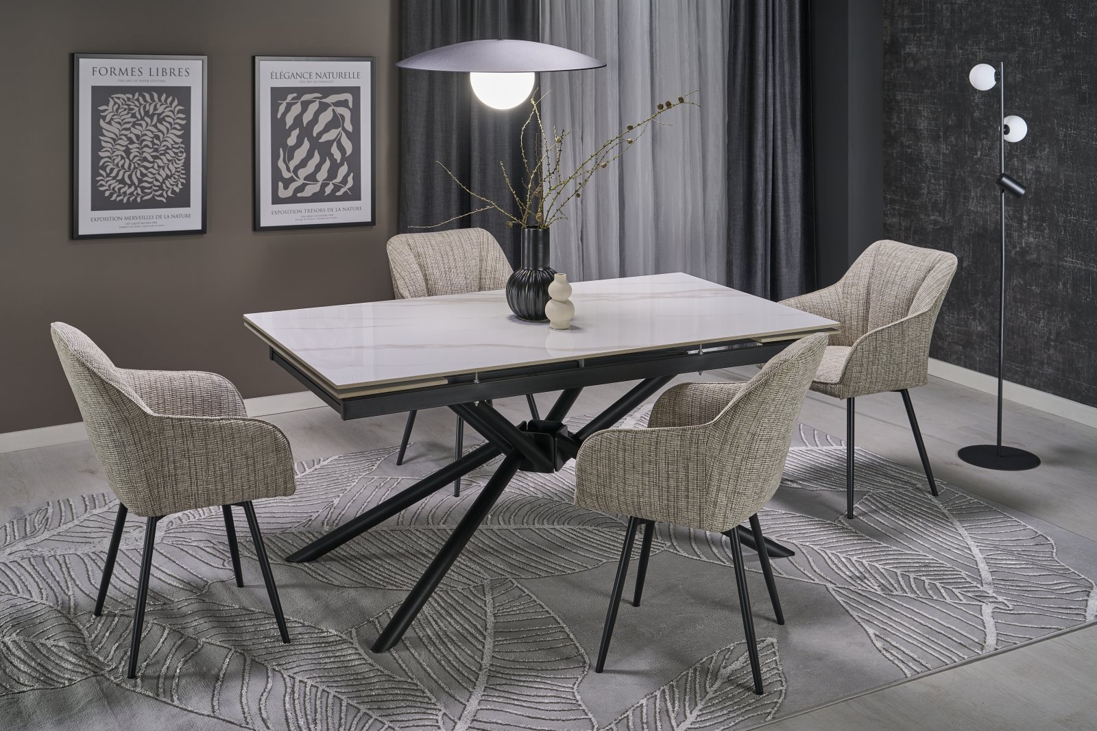 wymiary: 160-220/90/75/125 cm; stół rozkładany, materiał: spiek / stal malowana proszkowo, kolor: blat – biały marmur, nogi – czarny