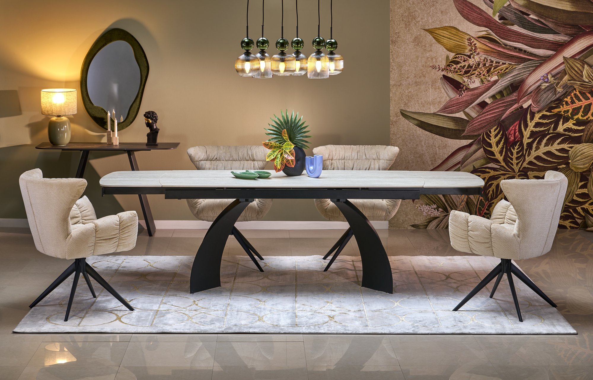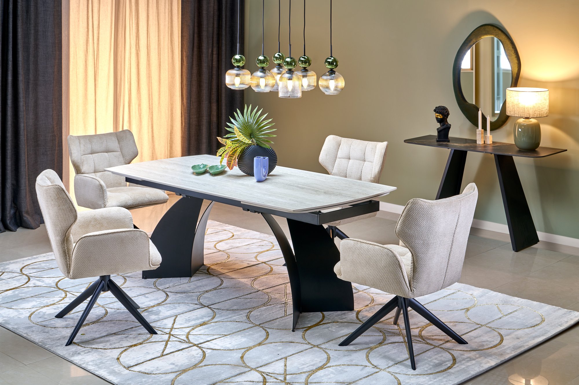 VITRUS stół rozkładany, blat – jasny trawertyn, nogi – czarny