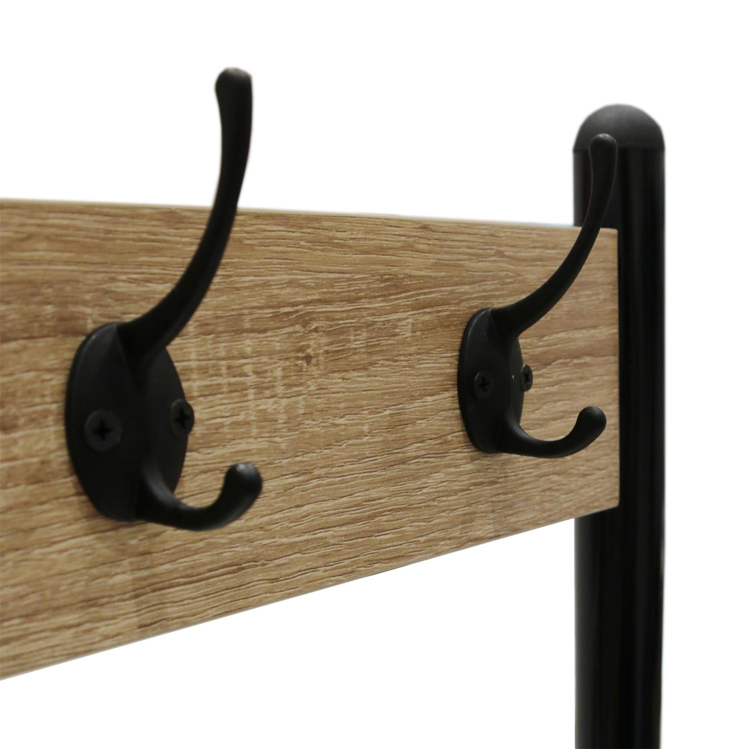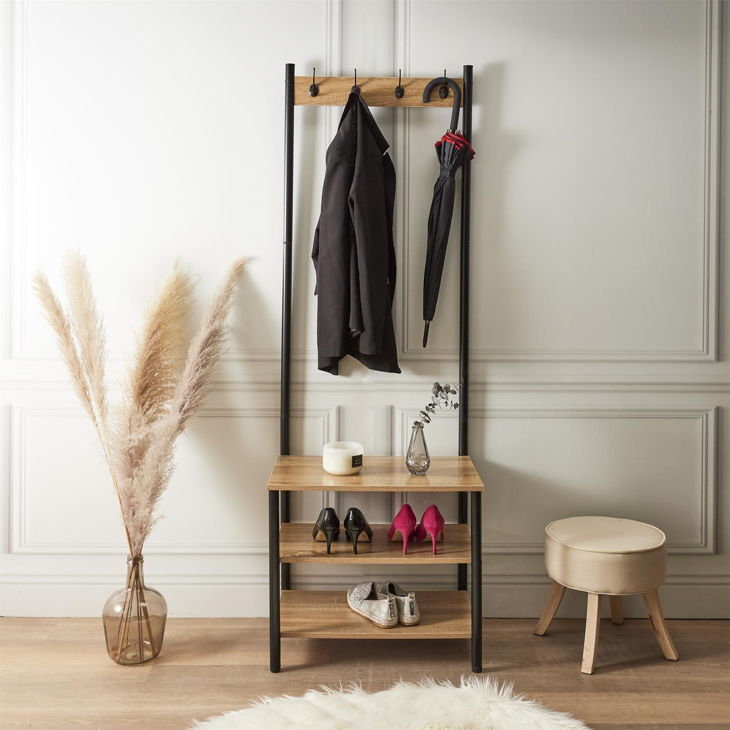 Wieszak do przedpokoju z 3 półkami w stylu loftowym to idealny mebel do wnętrza, które chcemy w łatwy i szybki sposób przemeblować. Wieszak wykonany z płyty MDF o laminacie imitującym buk oraz metalowej, czarnej malowanej proszkowo ramy. Cztery haki na kurtki o ciekawym loftowym kształcie dodają wieszakowi ciekawego wyglądu. Wymaga montażu