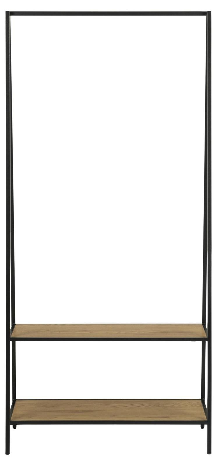 Wieszak Seaford w industrialnym stylu posiada metalowy szkielet malowany proszkowo na kolor czarny. W jego dolnej części znajdują się dwie szerokie półki z płyty MDF oklejone laminatem w kolorze dzikiego dębu. W górnej części wieszak posiada umieszczoną w poprzek metalową rurkę, na której zawiesić można nawet duże elementy odzieży tj. kurtki czy długie sukienki. Ilość kartonów: 1 Wymiary kartonów: 175x46x8cm Waga kartonów: 9,8kg