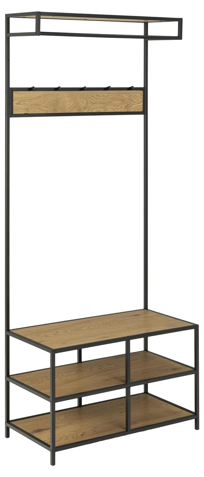 Wieszak na ubrania Seafor to praktyczna konstrukcja zawierająca w sobie uchwyty i dodatkowe półki. Do produkcji wykorzystano malowany proszkowo metal i płytę MDF w okleinie imitującej dąb. Dodatek idealny do przedpokoju w stylu nowoczesnym lub industrialnym, pomoże zachować porządek. Na uchwytach można przechowywać kurtki, a na półkach z powodzeniem zmieszczą się buty. Wymiary: 77x40x185 cm Waga: 20 kg