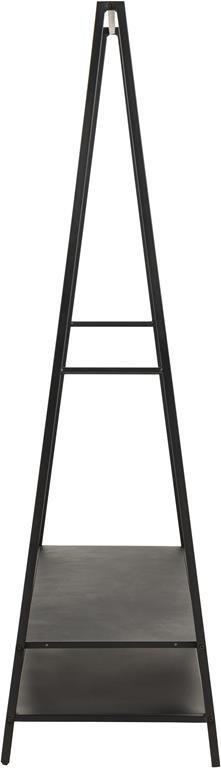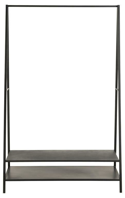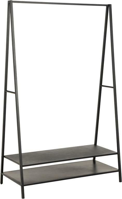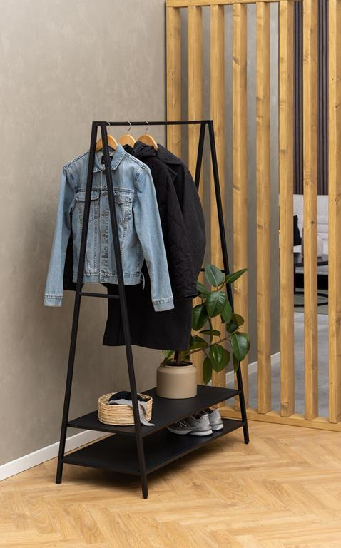 Ten stojak na ubrania ma mnóstwo miejsca na wieszaki i wniesie minimalistyczny, nowoczesny styl do każdego przedpokoju. Czarny metal i przemyślane, odważne linie nadają mu współczesny wygląd. Jest stylowy i funkcjonalny – można nawet umieścić buty na dolnych półkach.
