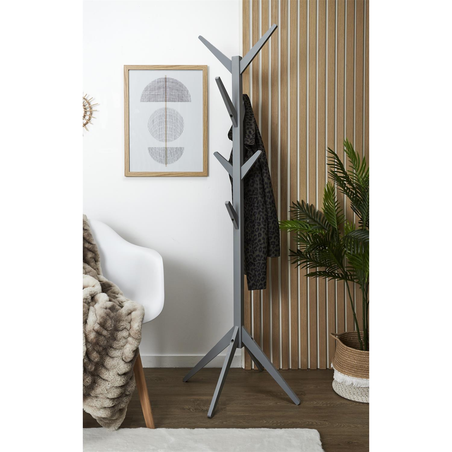 Drewniany, wysoki wieszak podłogowy sprawdzi się w przedpokoju lub poczekalni. Wieszak wykonany z lakierowanego MDF. Jego haki zrobione zostały również z wytrzymałej płyty MDF o ciekawym i nietypowym kształcie.