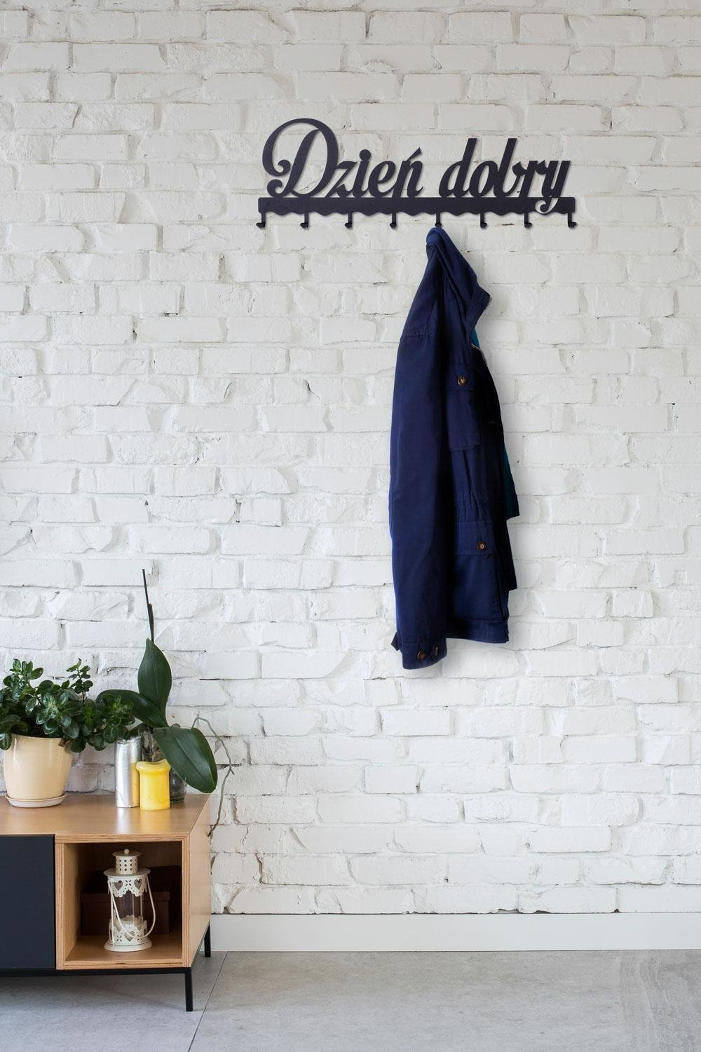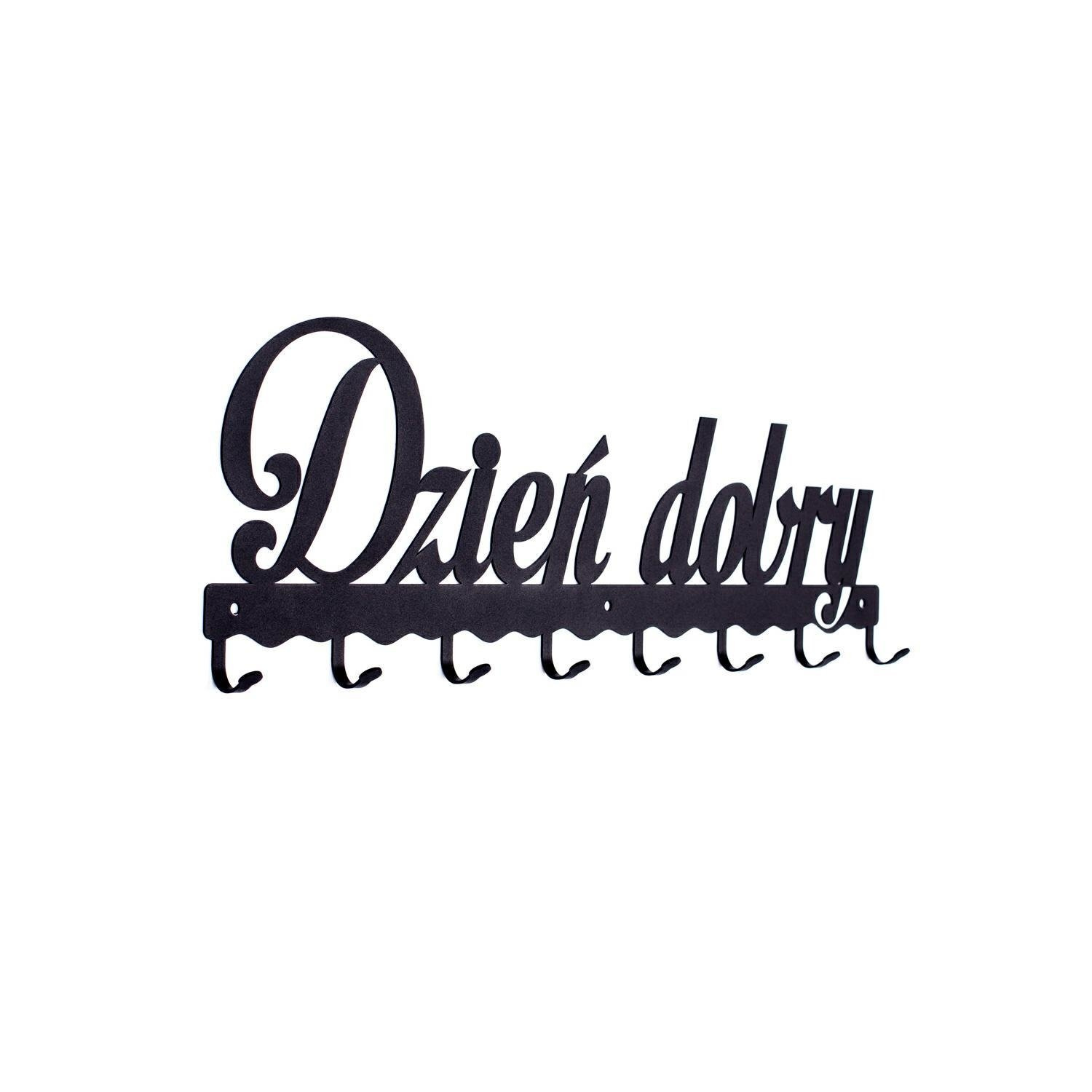 Wieszak ścienny Dzień dobry jest praktycznym rozwiązaniem do każdego przedpokoju, holu lub poczekalni. Wycinany laserowo uniwersalny napis ociepli każde wnętrze.Produkt wykonany został z wytrzymałego metalu malowanego proszkowo. Wieszak posiada 8 haczyków, o maksymalnym obiciążeniu 3kg każdy, które pomogą utrzymać porządek na korytarzu, holu czy poczekalni. Utrzymany w eleganckim stylu wieszak wtopi się we wnętrze dodając mu wyjątkowo przytulnego charakteru. Maksymalne obciążenie listwy to 24kg. Do wieszaka załączony jest zestaw montażowy, składający się z kołków, śrubek i zaślepek.