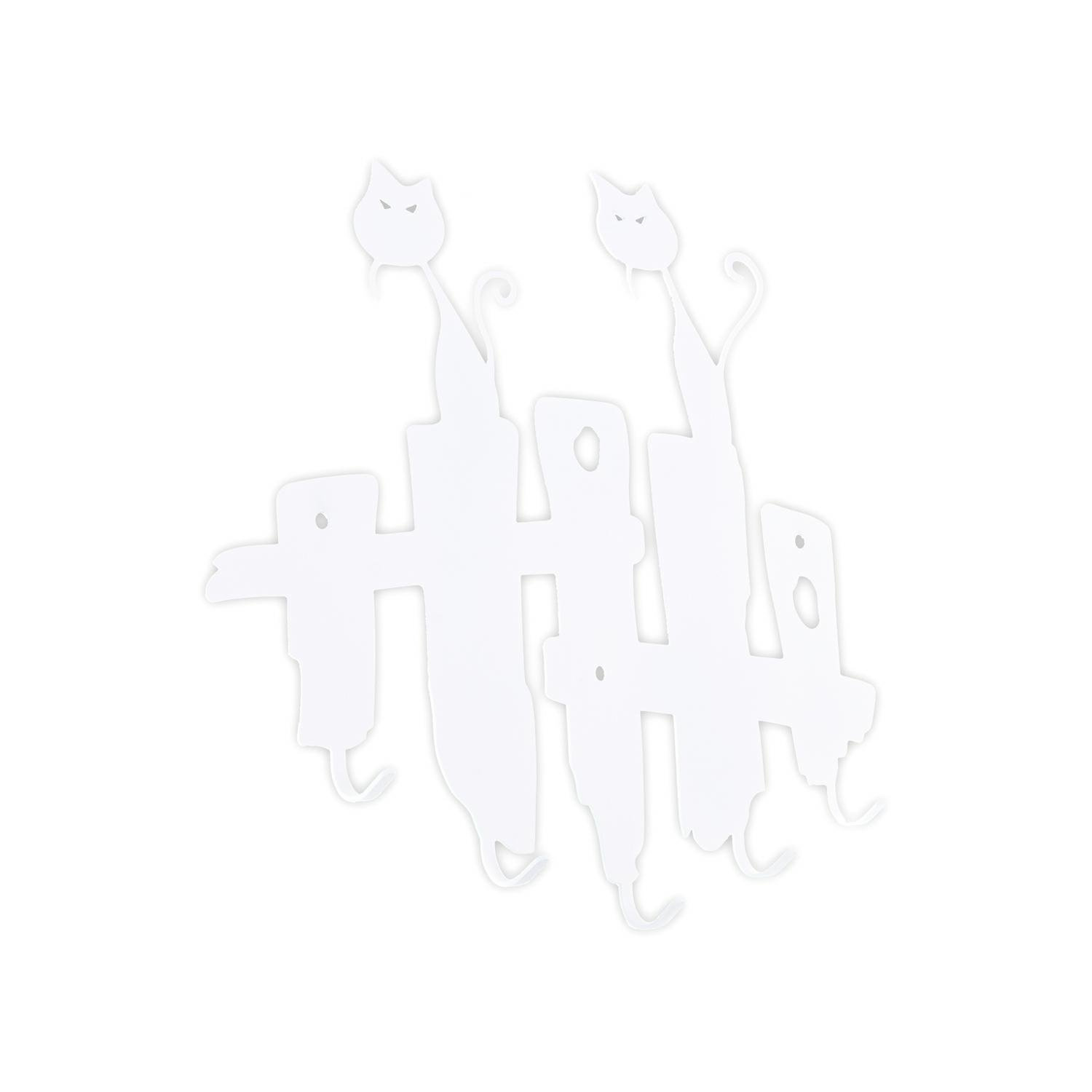 Wieszak ścienny Koty to stylowe rozwiązanie do przedpokoju, holu lub poczekalni. Wycięty laserowo wzór przedstawiający koty na płocie, nada uroku każdemu wnętrzu. Stalowy malowany proszkowo wieszak jest uniwersalny oraz odporny na uszkodzenia. Matowe wykończenie dodaje listwie stylu. Dzięki 5 haczykom o udźwigu do 3kg każdy, możemy powiesić na wieszaku klucze, kurtki lub nawet torby. Produkt dostępny jest w dwóch kolorach co zwiększa jego możliwości aranżacyjne. Maksymalne obciążenie to 15kg. Do wieszaka załączany jest zestaw montażowy, który składa się z kołków, zaślepek i śrubek.