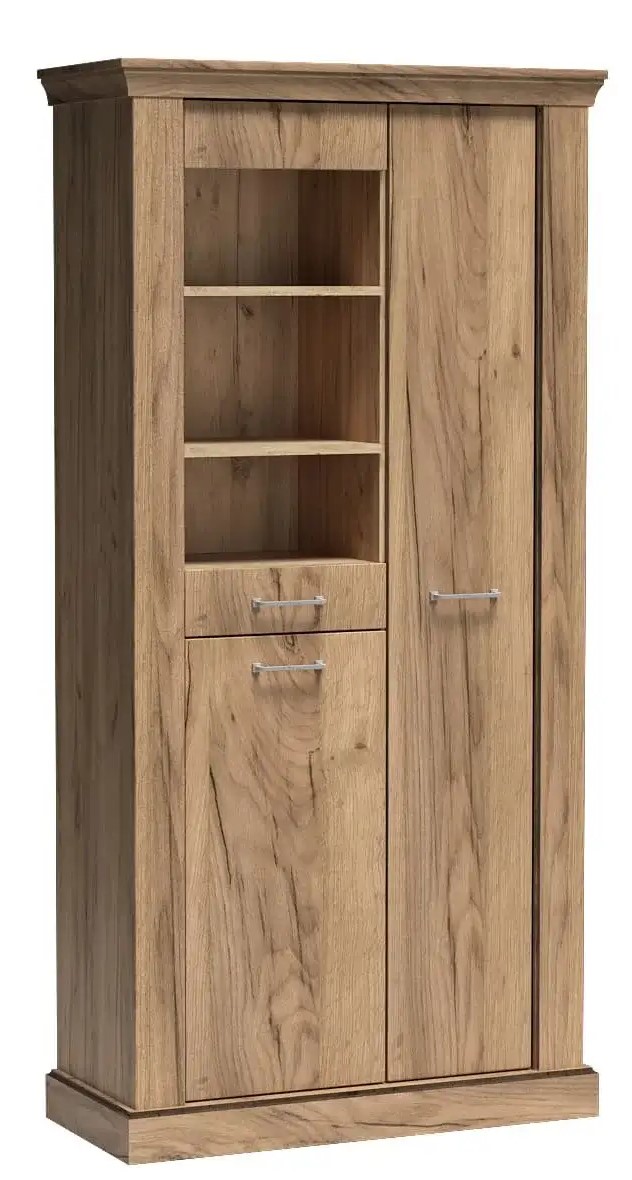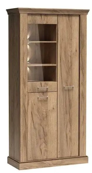 Pojemna witryna z kolekcji Antica o unikatowej budowie, która zaskoczy nie jednego gościa. Mebel posiada trzy szafki, dwie z pełnymi frontami oraz jedne ze szkłem hartowanym. W szafkach jest siedem półek, co daje ogromną możliwość łatwej organizacji, dużo rzeczy, ozdób, akcesoriów czy ubrań pomieści się w jednym miejscu. Witryna wykończona jest pięknymi metalowymi uchwytami. Funkcja cichy domyk ułatwia korzystanie z mebla. Dostępna w kolorze kraft złoty.