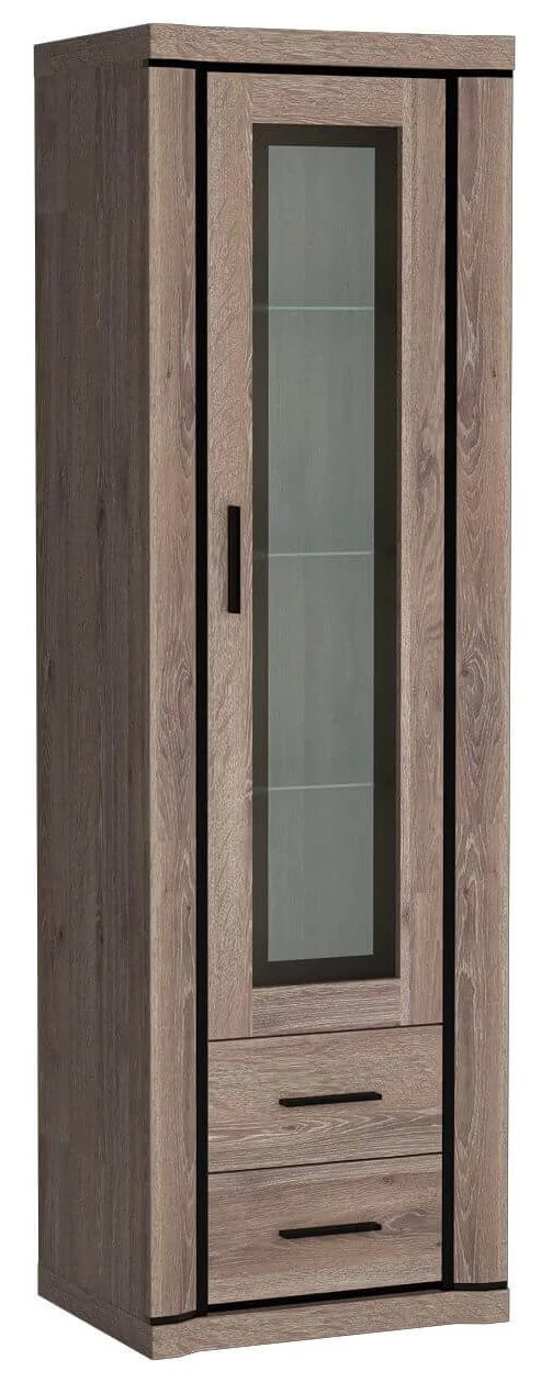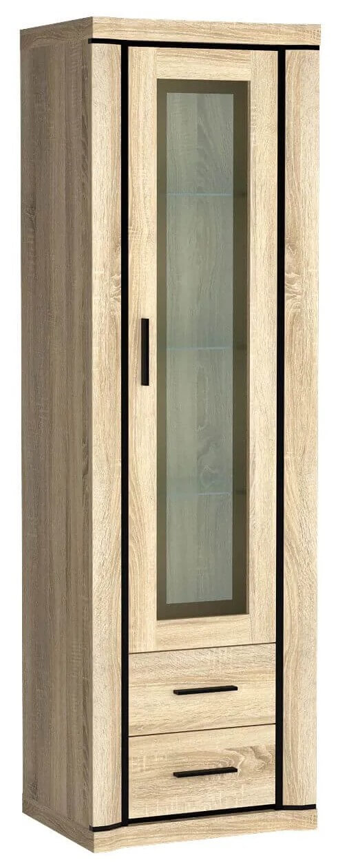 Piękna witryna wyróżniająca się prostym designem sprawdzi się nie tylko w salonie, ale odnajdzie swoje miejsce również w sypialni czy biurze. Trzy szklane półki wewnątrz witryny czynią ją unikatową, wygląda to niesamowicie i na pewno zwraca na siebie uwagę. Oprócz półek mebel posiada dwie szuflady, bardzo funkcjonalne, perfekcyjne aby schować tam drobiazgi, akcesoria. Metalowe uchwyty współgrające z czarnymi zdobieniami w postaci listew powodują wiele dobrych wrażeń na każdym. Dostępna w dwóch wybarwieniach.