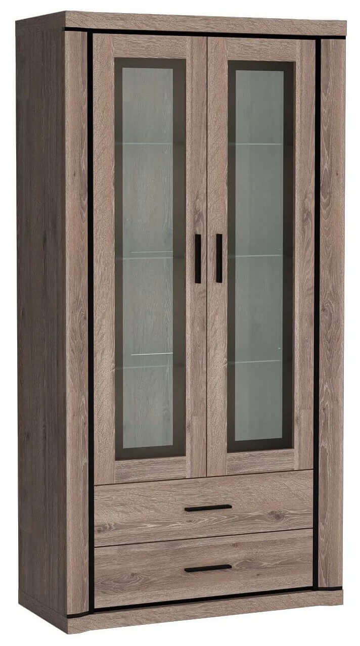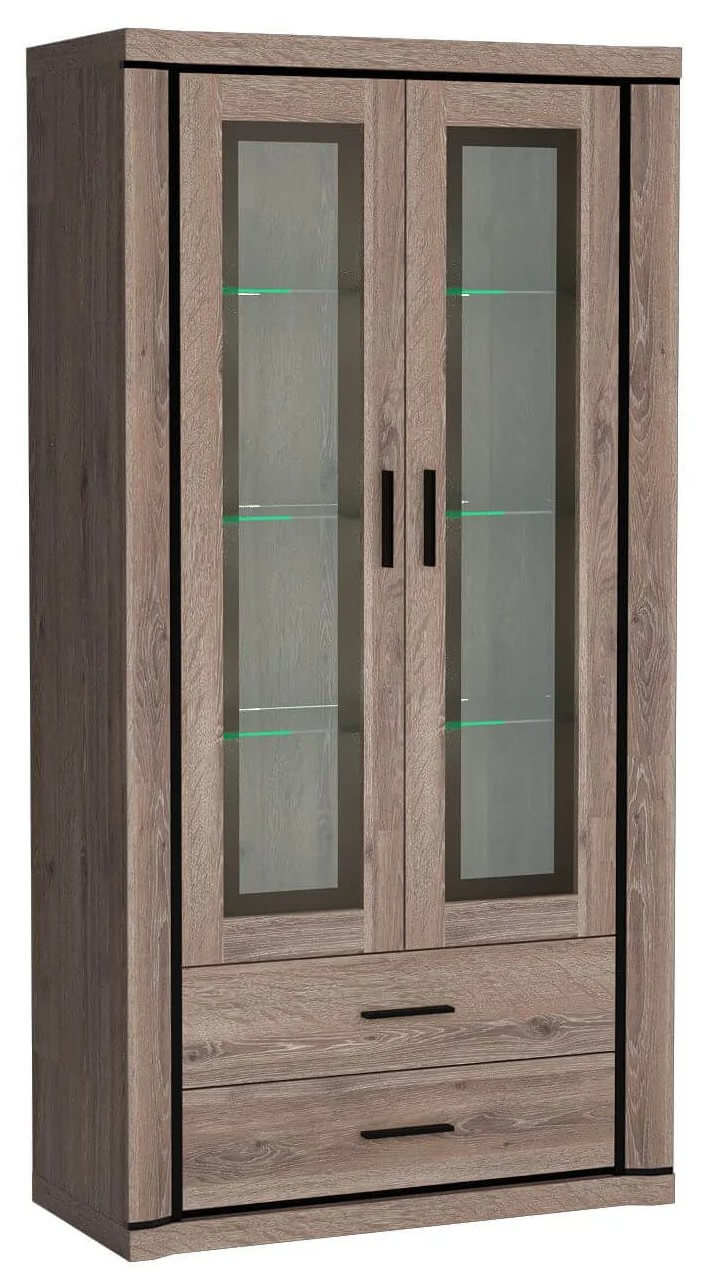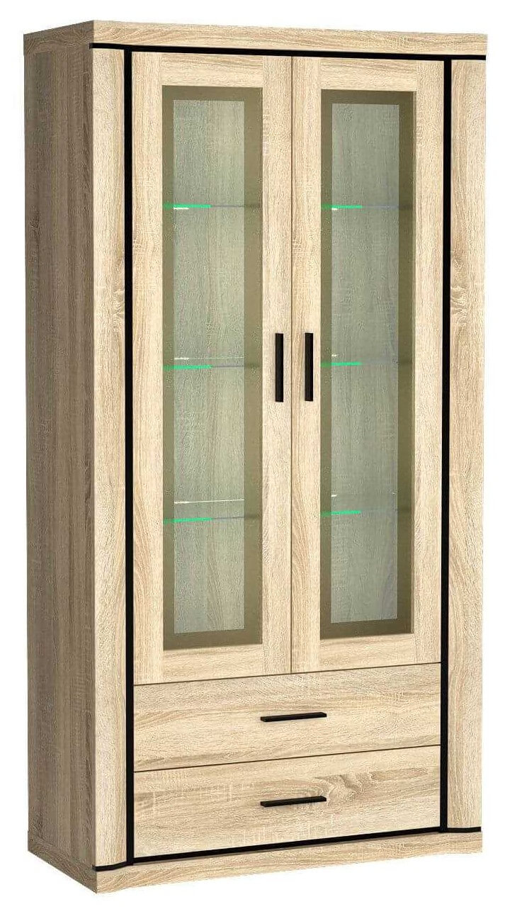 Witryna za sprawą prostego desingu i szerokiego wyboru w kolorach, łatwo wpasuje się w każde pomieszczenie, dodając mu klasy i charakteru. Płyty laminowane o grubości 48 mm to świetny wybór, aby zapewnić bezpieczeństwo witryny. W środku znajdziemy trzy piękne półki szklane, na których świetnie wyeksponujemy nasze przedmioty. Równie funkcjonalne są dwie szuflady. Witryna posiada piękne i oryginalne obramowania w postaci czarnych listew oraz metalowe uchwyty, które niesamowicie się prezentują i przykuwają uwagę. Dostępna w dwóch wybarwieniach.
