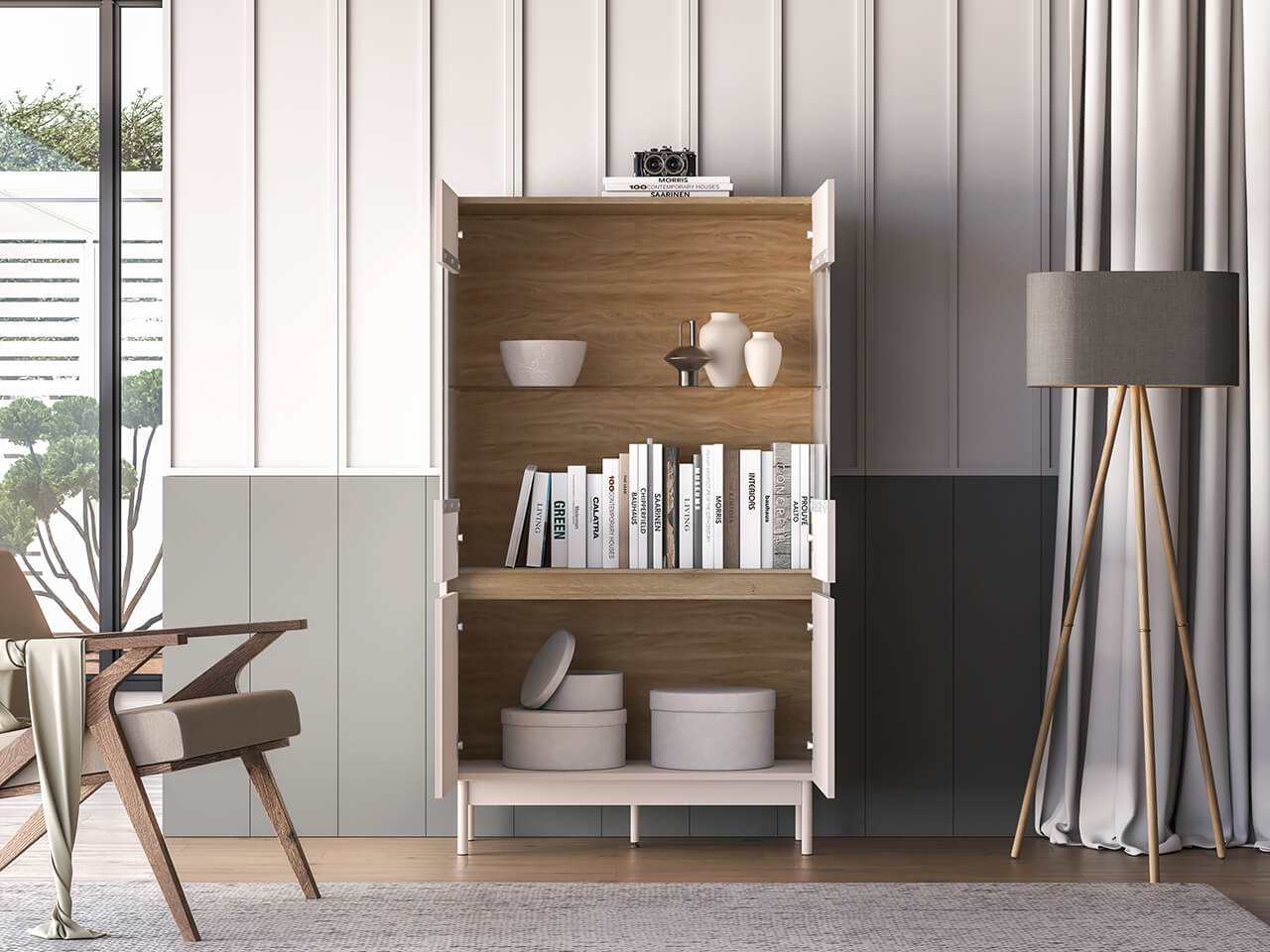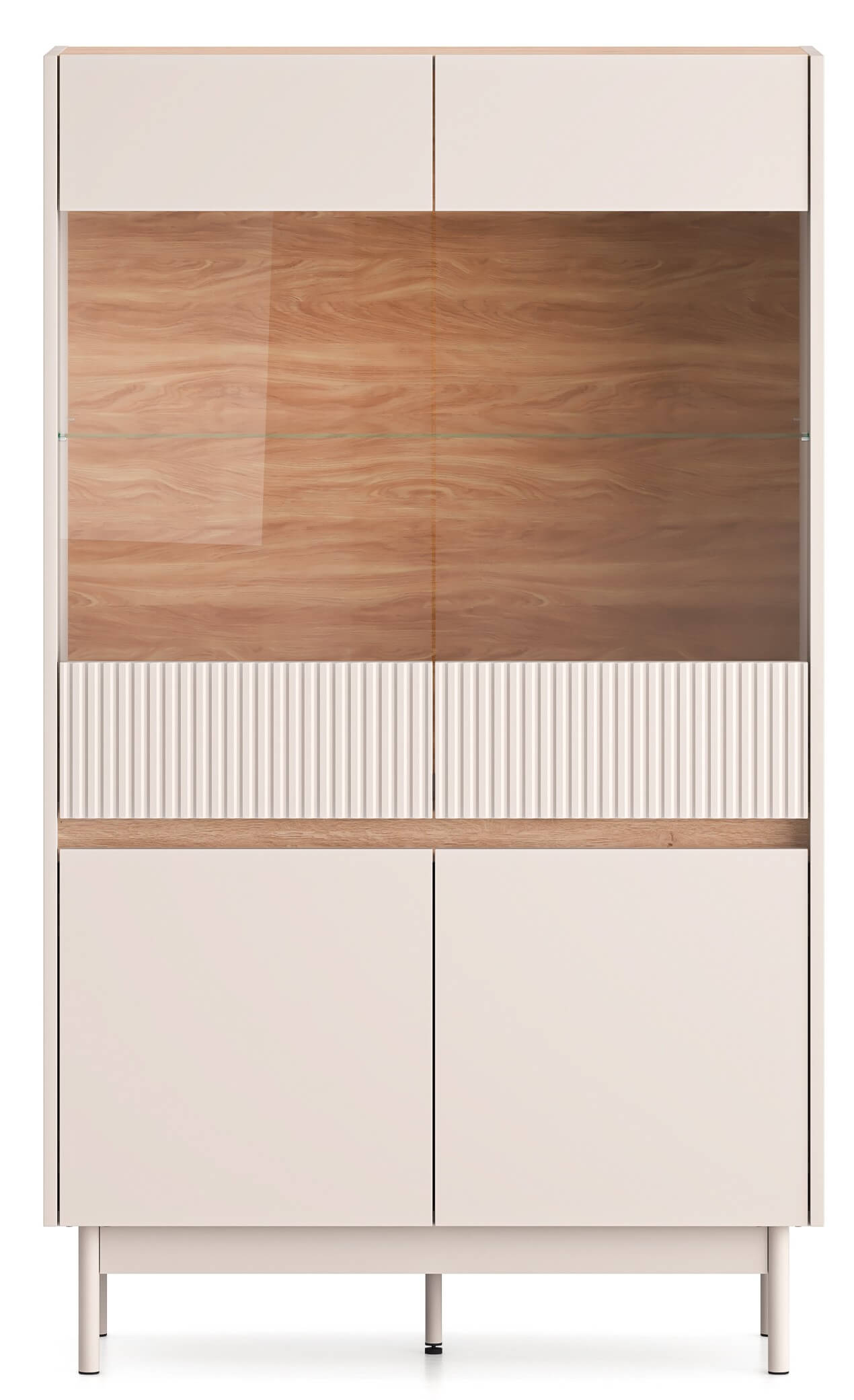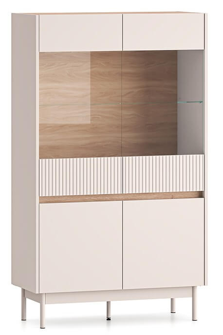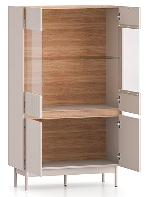 Witryna Dunea 03 to mebel, dzięki któremu przechowasz i wyeksponujesz swoje ulubione przedmioty. Mebel podzielony jest na dwie zamknięte części. Dolna to miejsce niedostępne dla oczu Twoich gości. Schowasz w nim obrusy czy ręczniki. Górna część to przestrzeń podzielona szklana półką tworzącą dwie szerokie wnęki. Dzięki przeszklonym drzwiczkom wyeksponujesz ulubione, porcelanowe filiżanki czy piękną, stylowa zastawę. Wybierz witrynę Dunea i zachowaj porządek w swoim wnętrzu.