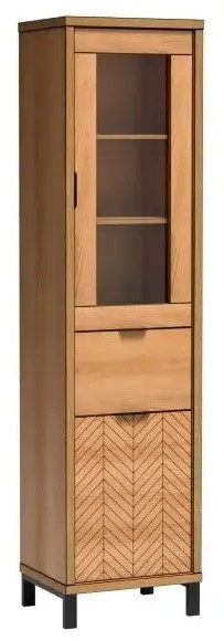 Witryna z kolekcji FONTI. Mebel posiada dwie szafki, jedna z pełnym frontem z jedną półką, która dzieli przestrzeń na pół, druga szafka ze szklanym z dwoma półkami. Pojemne szuflady w centrum witryny pomieszcą każdy dobiazg. Dostępna w kolorze dąb karmel.