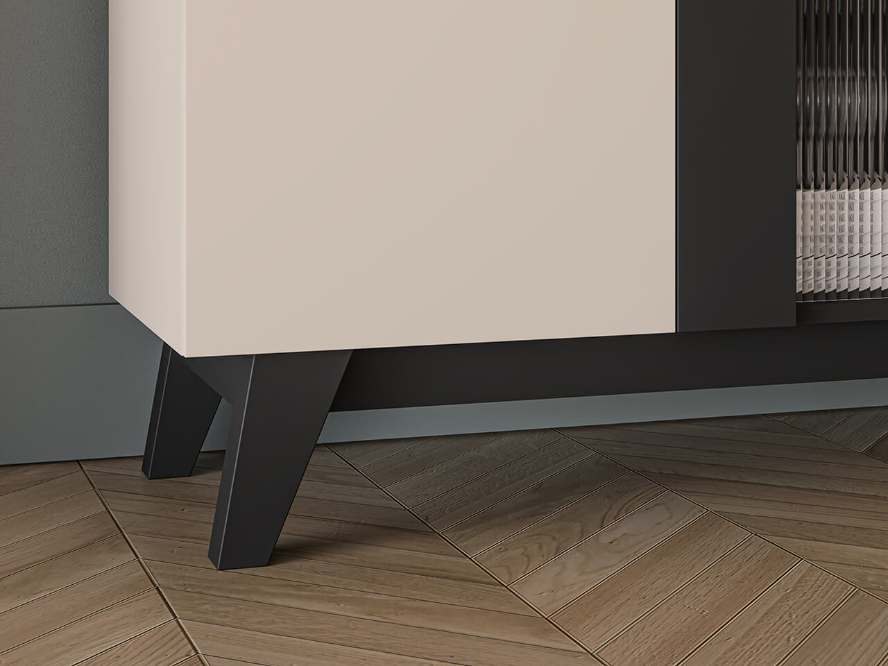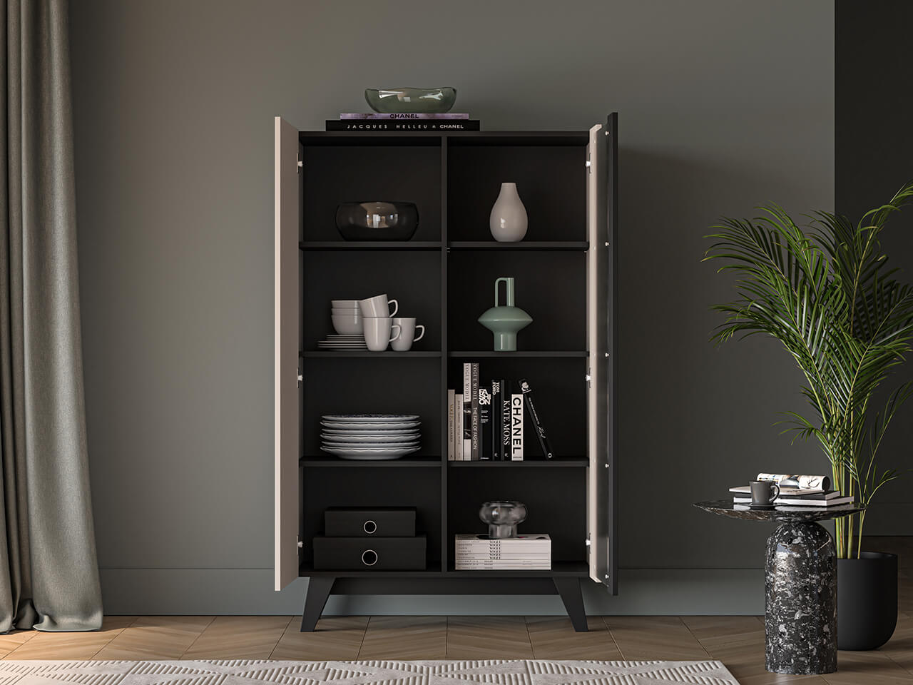 Witryna Freshion 02 to mebel, dzięki któremu przechowasz i wyeksponujesz swoje ulubione przedmioty. Wnętrze mebla podzielone jest na osiem pojemnych wnęk. Lewa część mebla zamknięta całościowymi drzwiami pozwoli schować obrusy, ręczniki czy dokumenty. Prawą stronę bryły zamykają drzwi z dekoracyjnego, teksturowanego szkła. Takie karbowanie efektownie załamuje światło. Widok ustawionych z tyłu przedmiotów pięknie przenika przez oryginalnie żebrowany materiał.