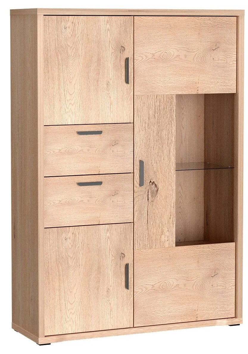 Po prawej stronie znajduje się przeszklona część z bezpiecznym, hartowanym szkłem w przydymionej wersji – idealna, by wyeksponować ulubione naczynia, dekoracje lub książki. Lewa strona to zamykana szafka na górze, dwie wygodne szuflady na środku i kolejna szafka na dole – zapewniające sporo miejsca na wszystko, co warto mieć pod ręką, ale poza wzrokiem.