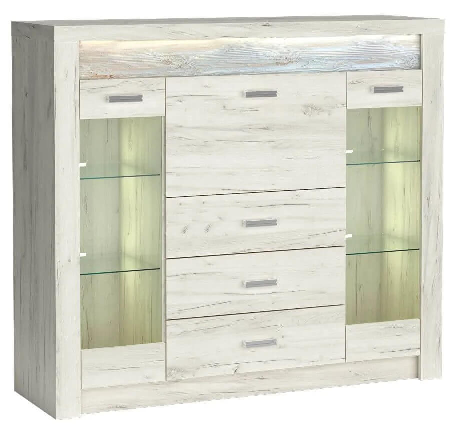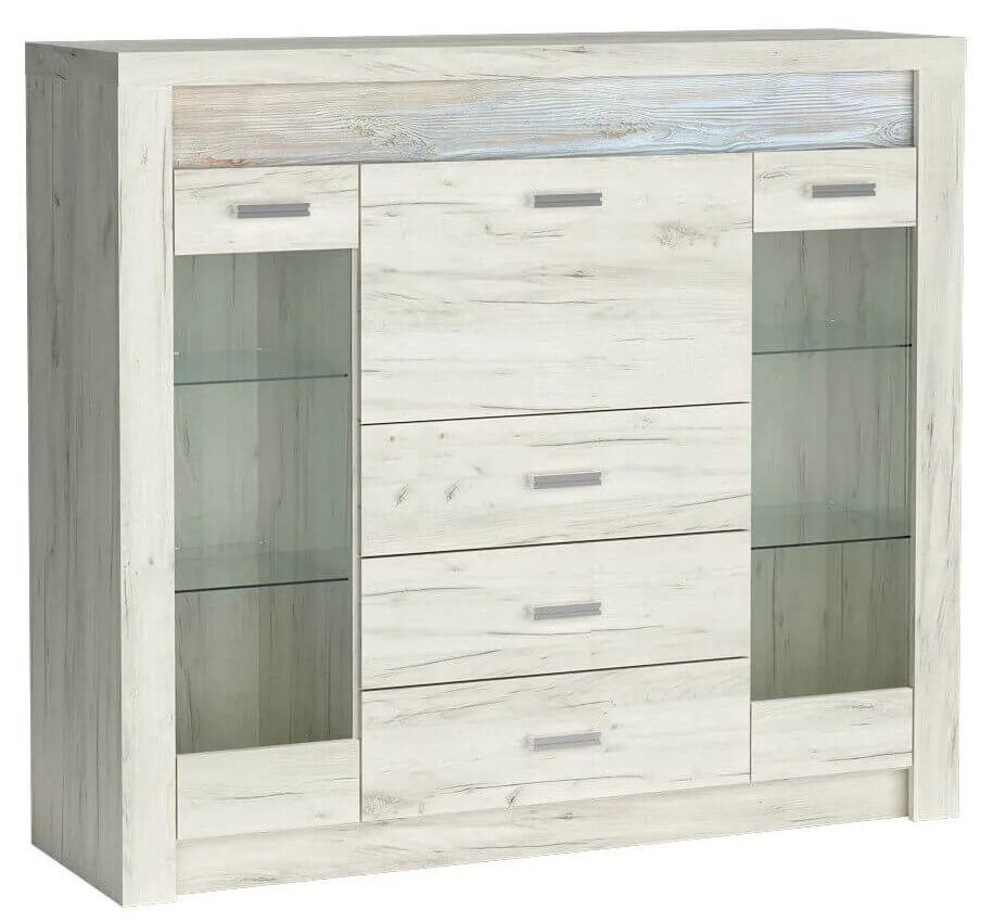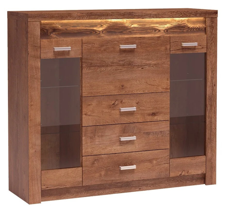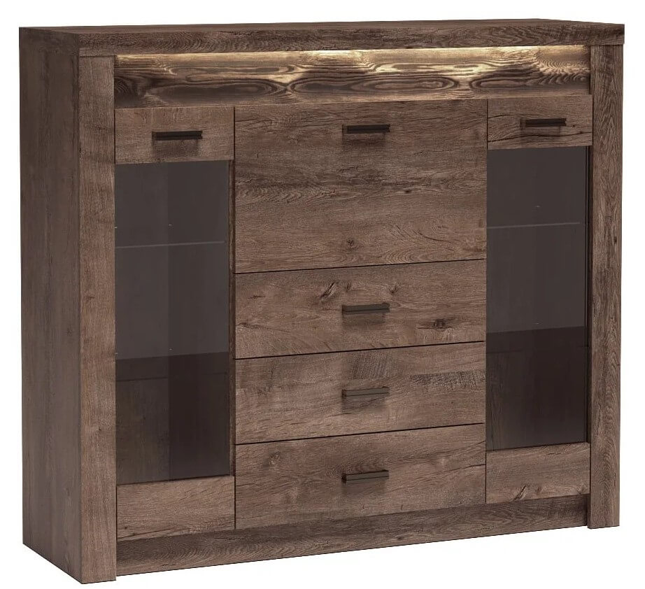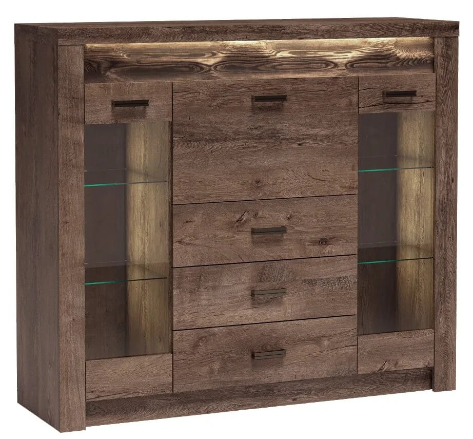 Wysoka komoda z witrynami po bokach z podwójnymi szklanymi półkami w środku. W centrum mamy trzy głębokie szuflady oraz barek. Witryny są idealne do eksponowania książek, porcelany czy pamiątek. Mebel pomieści bardzo dużo, jest pojemny i oryginalny, jeżeli chodzi o wygląd. Wpasuje się w każde pomieszczenie, salon, jadalnie czy przedpokój. Przyciągnie swoim krojem nie jednego gościa. Metalowe uchwyty podkreślają dbałość w detale. Możliwość zakupu mebla z pełnymi frontami. Dostępna w trzech wybarwieniach.