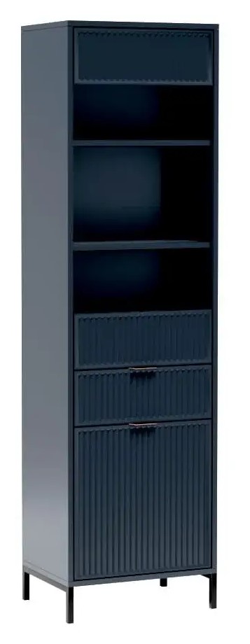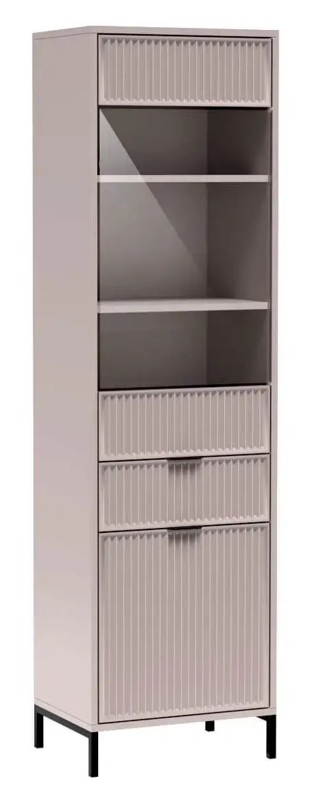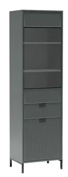 Piękna witryna, która ozdobi każdy salon swoim designerskim wykończeniem. W dolnej części znajdziemy szafkę z półką a nad nią pojemną szufladę. Górna część to szklana witryna z dwoma półkami. Witryna została wyposażona w system push to open. Dostępna w trzech kolorach – cashmere/indigo/green stone.