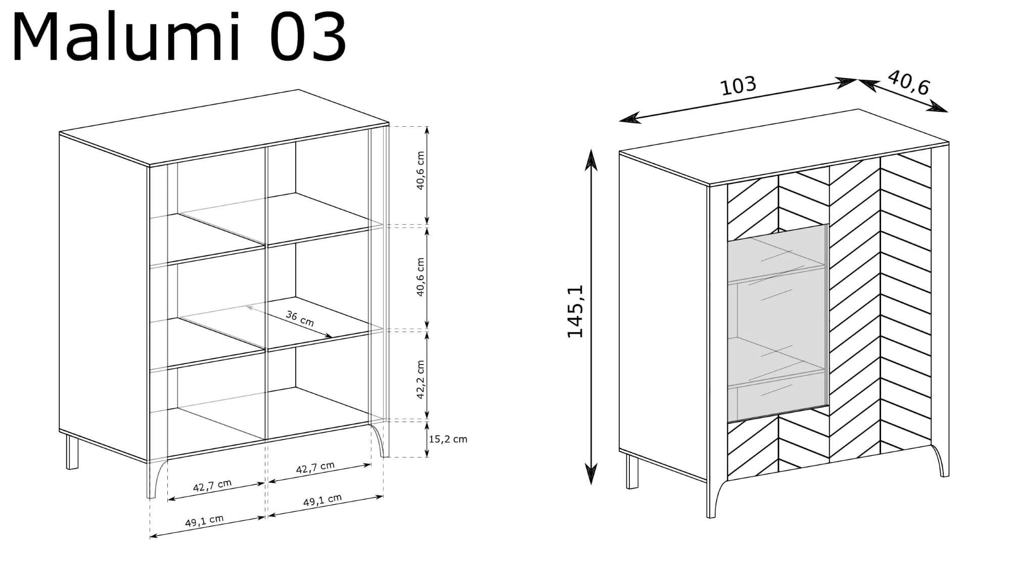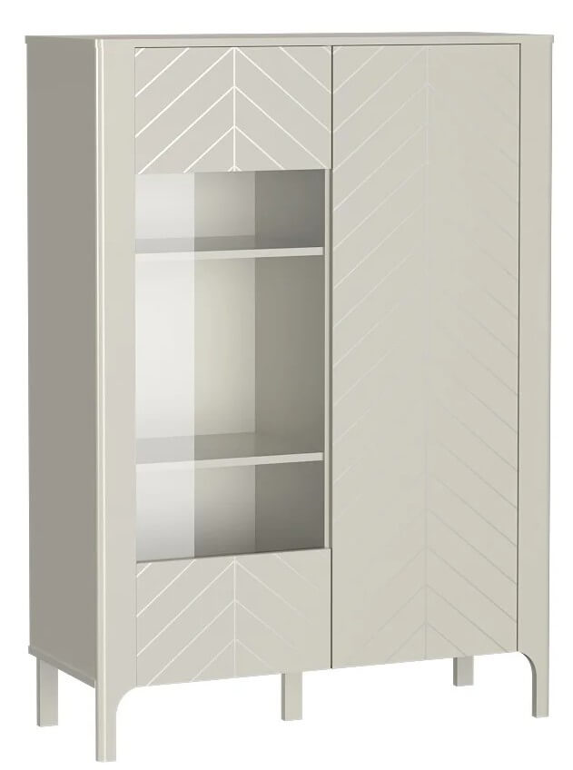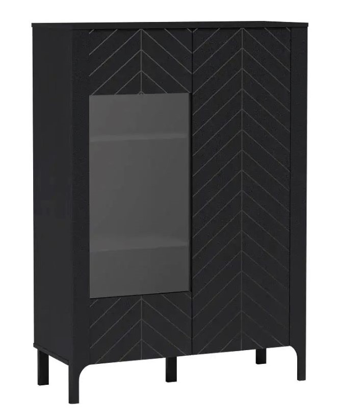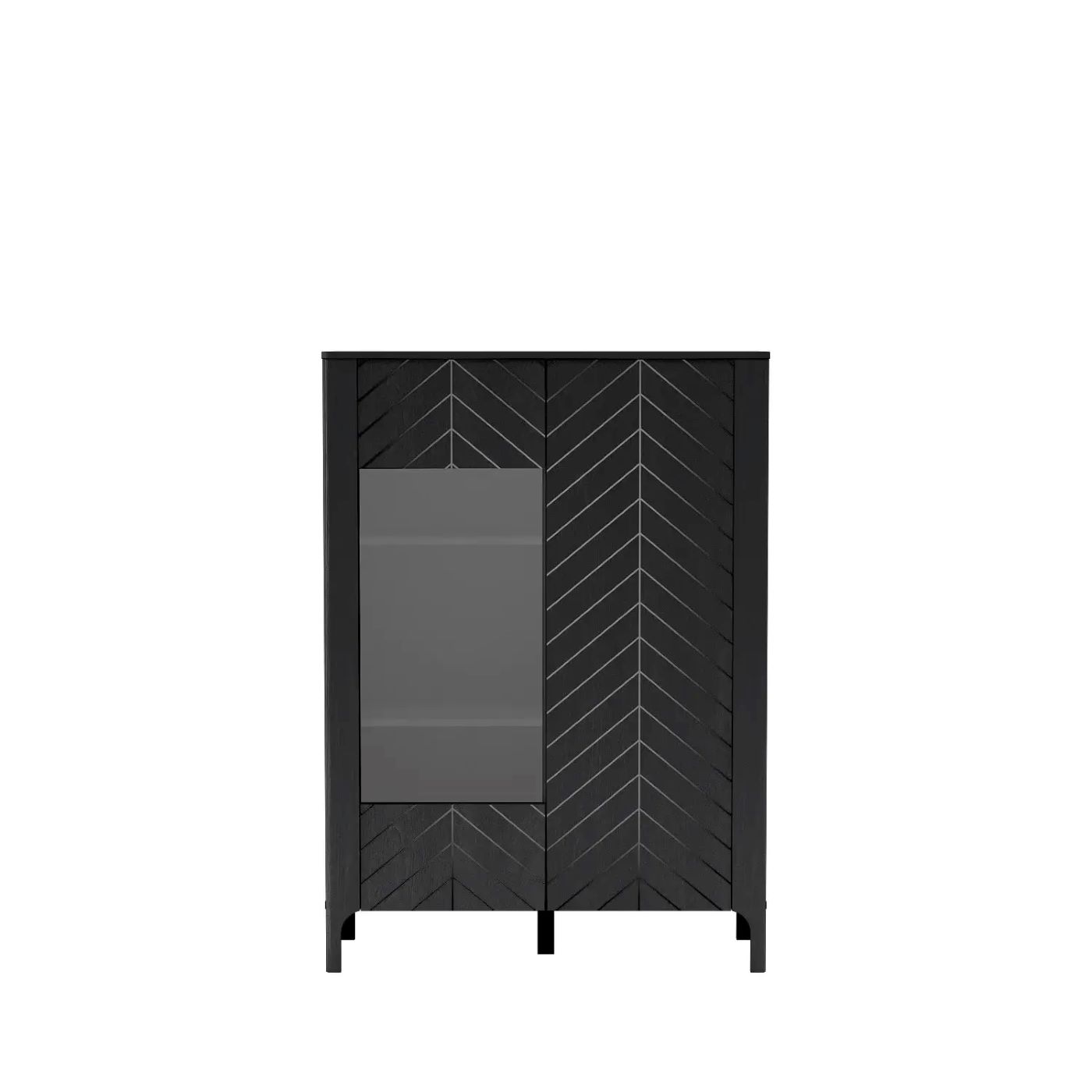 Dodaj elegancji i funkcjonalności do swojego wnętrza dzięki tej nowoczesnej witrynie. Wykonana z wysokiej jakości materiałów, posiada fronty z subtelnym wzorem w jodełkę, które nadają jej wyjątkowego charakteru. Połączenie czerni z unikalnym wzorem idealnie wpisuje się w nowoczesne i minimalistyczne aranżacje. Witryna wyposażona jest w pojemne półki, które pozwalają na przechowywanie i ekspozycję książek, dekoracji lub naczyń. Idealna do eksponowania ulubionych przedmiotów. Wykonana z trwałych materiałów, zapewnia stabilność i wytrzymałość na lata. Ten mebel doskonale sprawdzi się w salonie, jadalni lub gabinecie, podkreślając nowoczesny charakter wnętrza.