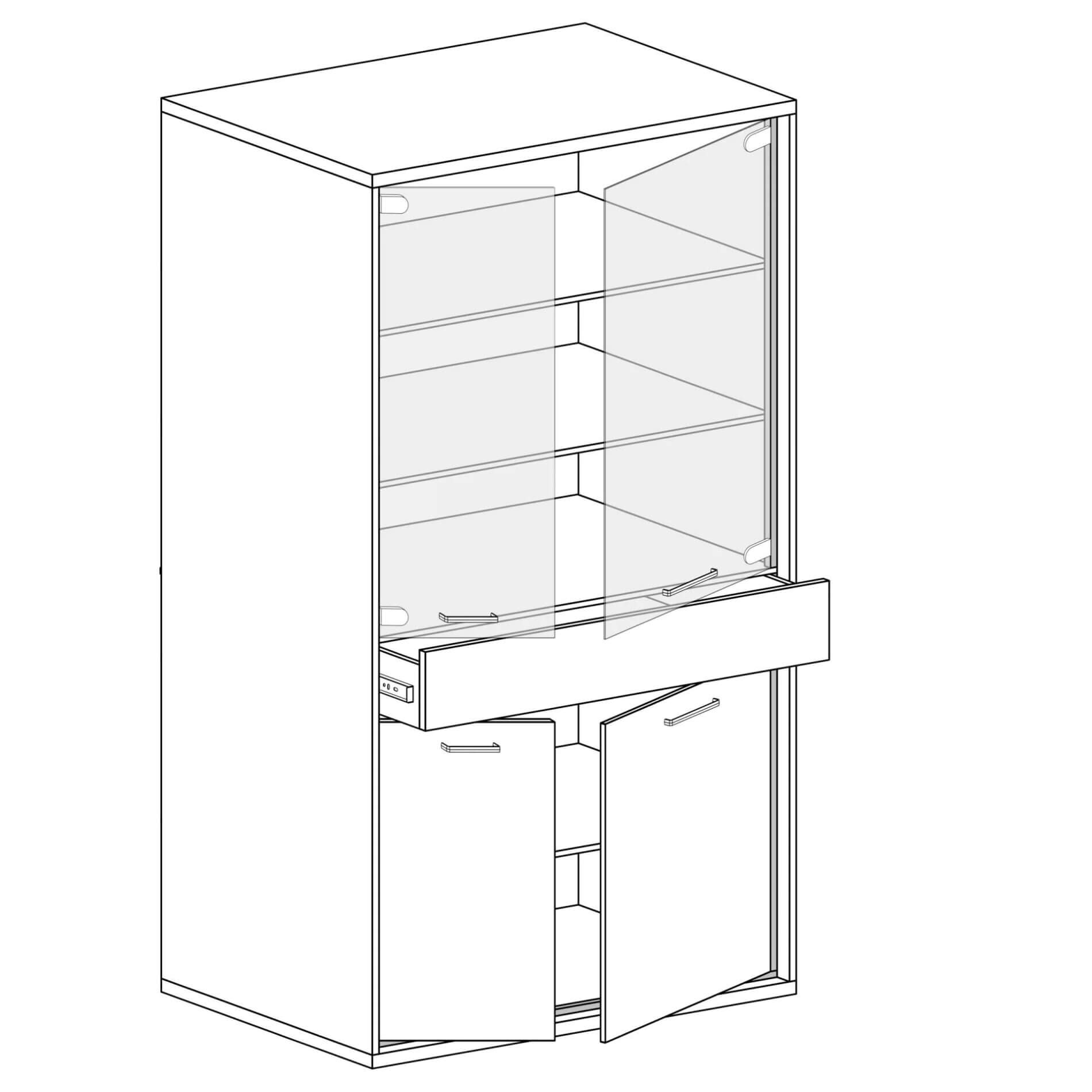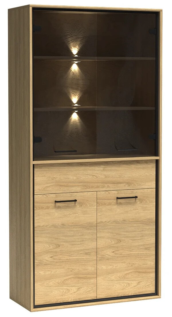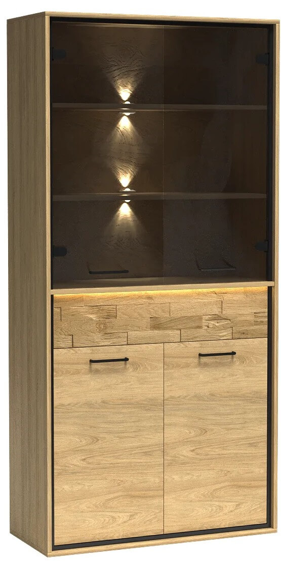 Myślisz jakie meble wstawić do jadalni? Witryna z kolekcji MEDIOLAN w naturalnym kolorze drewna hikora. Połączenie szafy dwudrzwiowej w dolnej części mebla i szklanej witryny na górze. Mebel idealnie wpasuje się w takie pomieszczenia jak jadalnia, gabinet, salon czy pokój dzienny. W jadalni doskonale wyróżni się ze świąteczną zastawą, gdy wykorzystamy opcję podświetlenia półek. Witryna pasuje do aranżacji w stylu nowoczesnym, industrialnym. Górna część szafy składa się z podwójnych frontów z przydymionego, hartowanego szkła i dwóch półek z płyty laminowanej. Dół szafy to jasne fronty z czarnymi, metalowymi uchwytami za którymi mamy do dyspozycji półkę. Nad dolną szafą znajduje się wysuwana szuflada, która otwiera się na dotyk. Wykorzystany nowoczesny system otwierania push to open. Można wykorzystać do niej dodatki takie jak czarne nogi, które będą pasować do czarnych listew i stworzą idealne zestawienie. Przód szuflady może być udekorowanych drewnianą, dębową deską. Dla lepszego efektu możemy wykorzystać oświetlenie LED półek szklanych i dekoracyjnej deski.