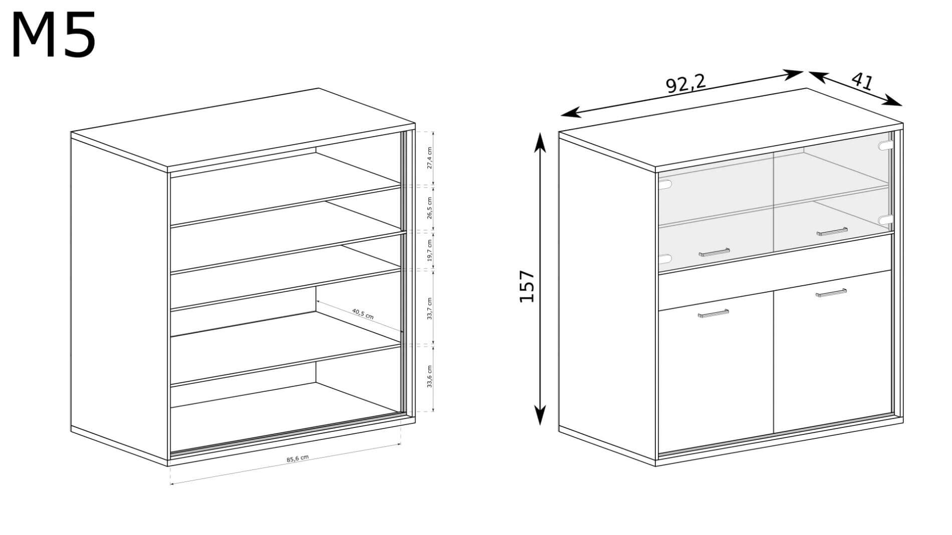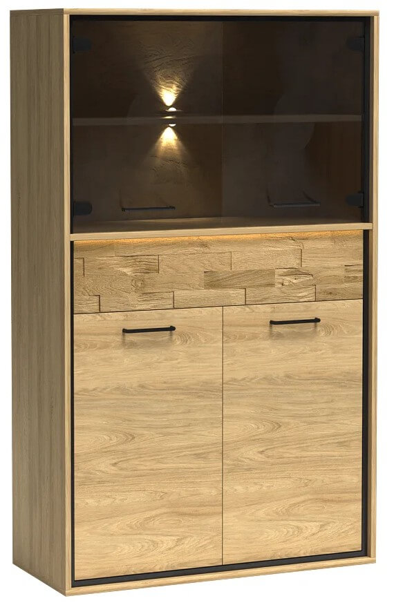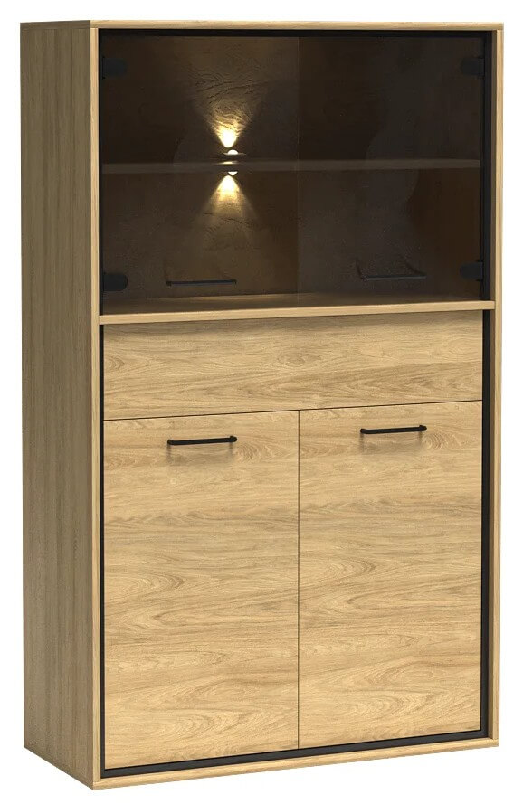 Na górze szafy znajduje się przeszklenie, gdzie możemy wyeksponować swoje pamiątki, drobiazgi, czy rzeczy dekoracyjne, ważne dla nas. Szklane fronty to bezpieczne, hartowane szkło z dodatkiem efektu przydymienia. W środku jest półka z solidnej, laminowanej płyty. W dolnej części szafy możemy natomiast schować rzeczy, które rzadko używamy. Obszerna dolna szafa posiada półkę, przez co jest bardzo pojemna i funkcjonalna. Pod szklaną częścią znajduje się szuflada wysuwana na prowadnicach, którą otworzymy na dotyk. Szafa posiada zawiasy z cichym domykiem. W opcjach dodatkowych możliwe jest dodanie czarnych nóżek, oświetlania LED półek i piękne rzeźbionej deski dębowej jako front szuflady. Szuflada może również zostać oświetlona, przez co uzyskamy interesujący klimat w naszych wnętrzach.