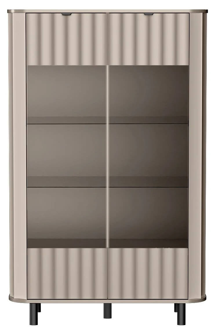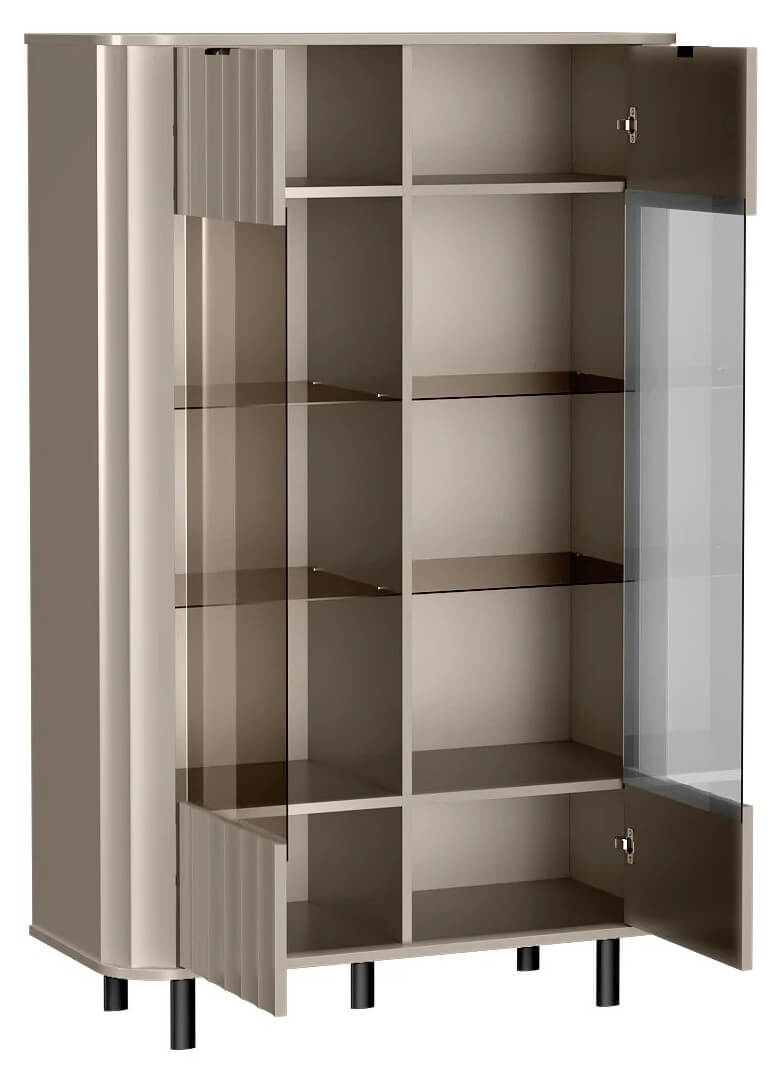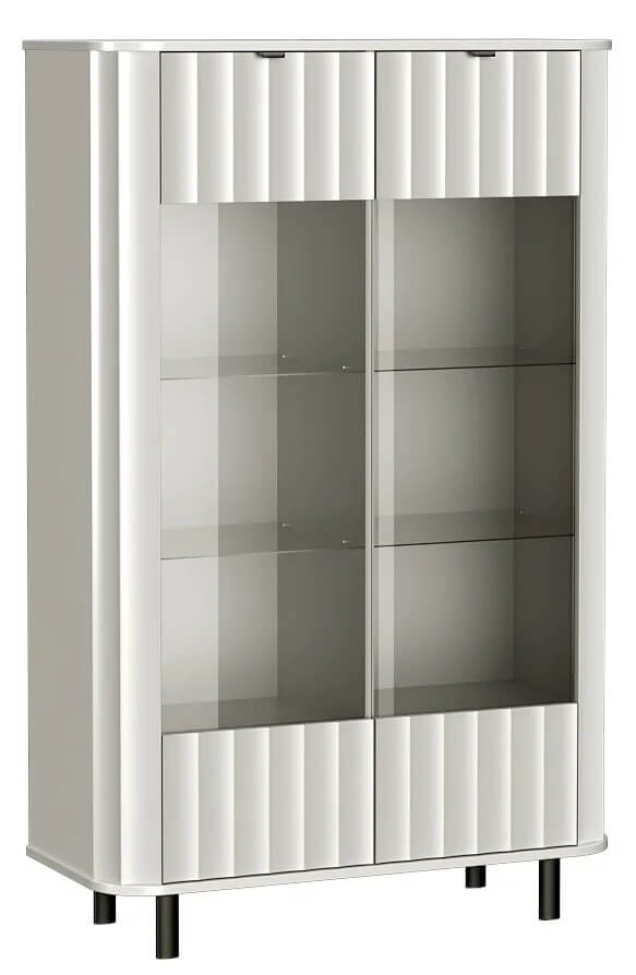 Estetyka kolekcji NOVADO objawia się tu w wielu detalach: zaokrąglone krawędzie nadają miękkości bryle, a smukłe, owalne nogi i minimalistyczne, metalowe uchwyty stanowią dopełnienie nowoczesnego charakteru mebla. Witryna dostępna jest w dwóch wariantach kolorystycznych – delikatnej bieli oraz modnym clay gray – dzięki czemu z łatwością dopasuje się do różnych aranżacji wnętrz.