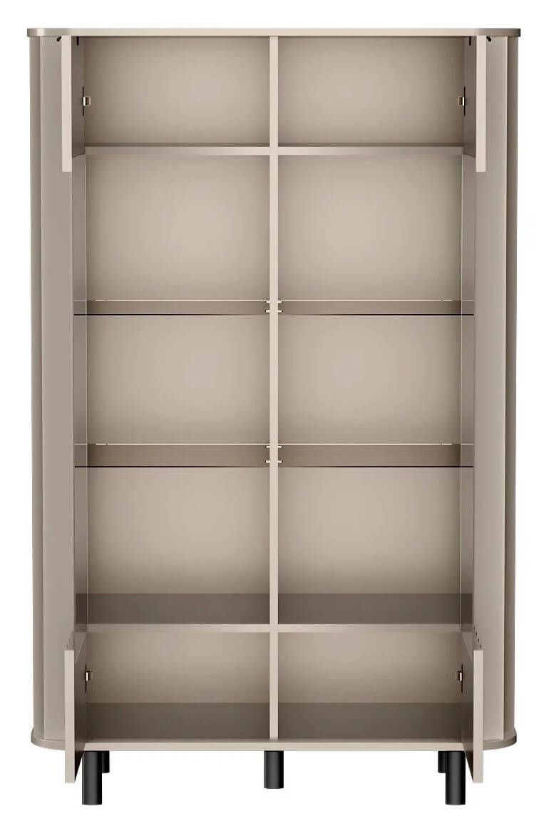 Wysoka i smukła forma witryny doskonale sprawdzi się w salonie, jadalni czy nawet w domowym biurze. Cztery szklane półki oferują przestrzeń idealną do prezentacji zastawy stołowej, dekoracji, kolekcji książek czy pamiątek. Dzięki zastosowaniu szkła mebel zyskuje wizualną lekkość, nie przytłaczając wnętrza – a przy tym wprowadza w nie nutę nowoczesnej elegancji.