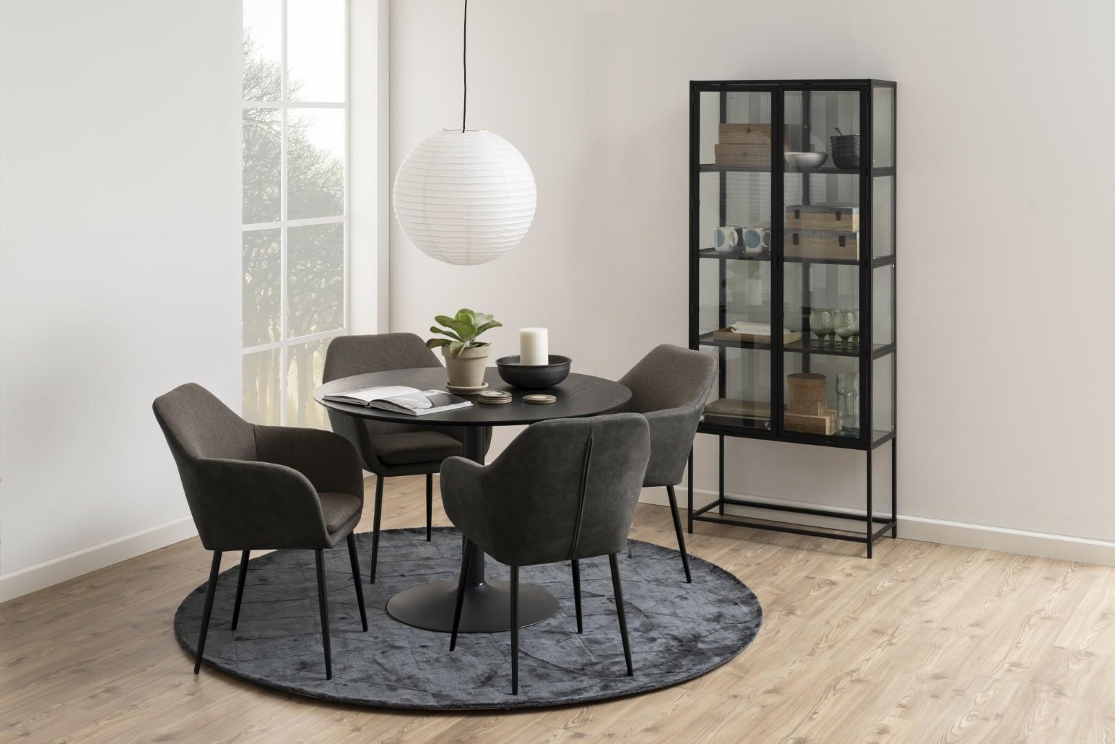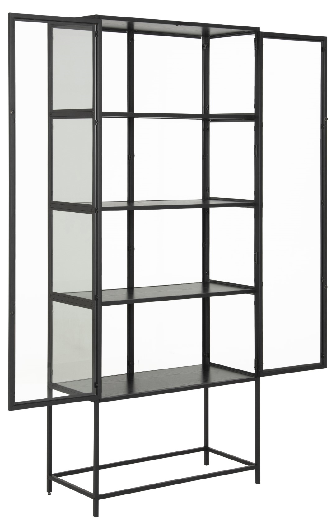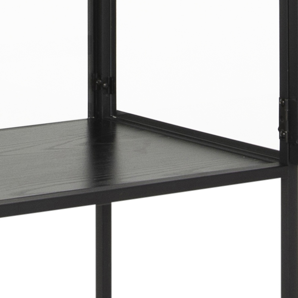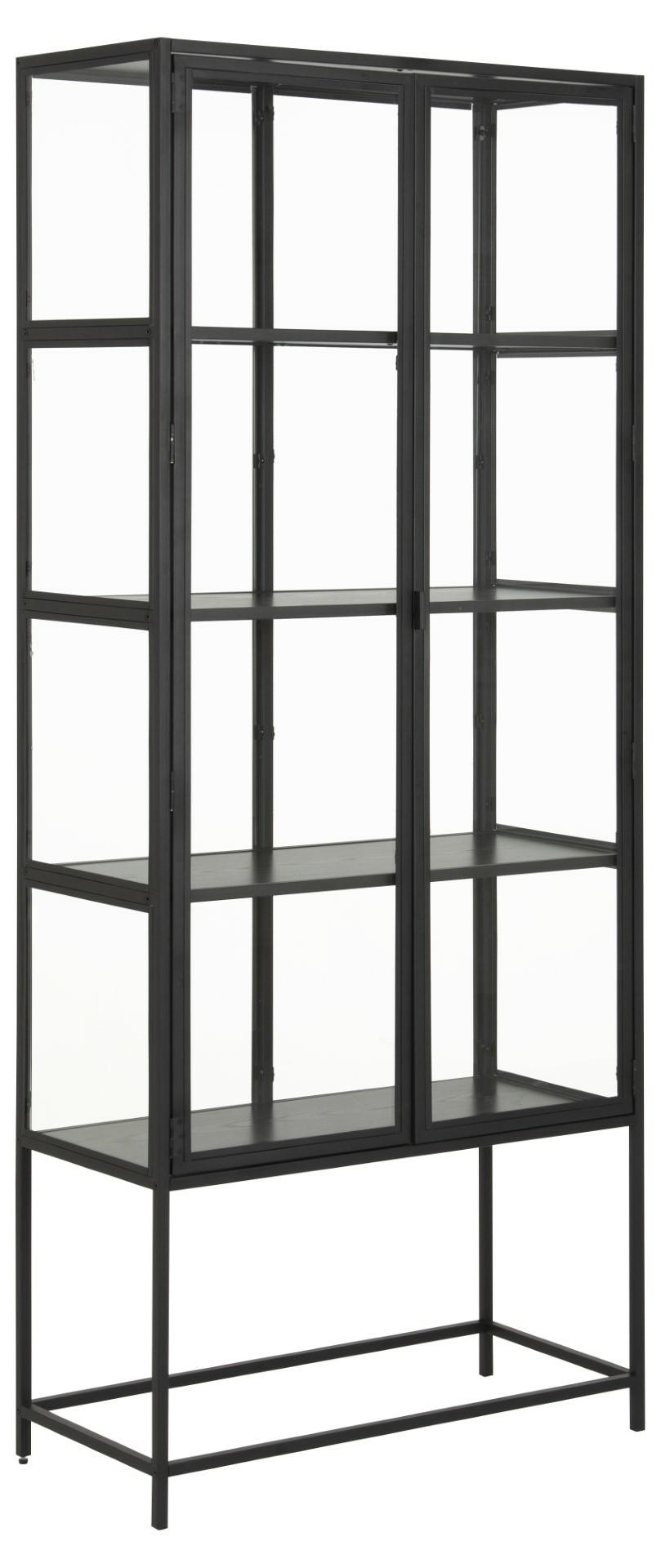Wysok witryna Seaford to kwintesencja stylu industrialnego. Wykonana z połączenia malowanego proszkowo metalu i przezroczystego szkła wygląda bardzo elegancko i nowocześnie. Wszystkie jej ściany jak i drzwiczki wykonane są ze szkła, dzięki czemu mebel nabiera wizualnej lekkości. Szyby osadzone są w metalowych obramowaniach. Górny blat witryny oraz cztery bardzo szerokie półki to płyty MDF w okleinie w kolorze czarnym. W witrynie pięknie zaprezentują się różnorodne kolekcje czy zastawy. Ilość kartonów: 2 Wymiary kartonów: 150x43x8,5cm 190×39,5×13,2cm Waga kartonów: 34kg 22,5kg