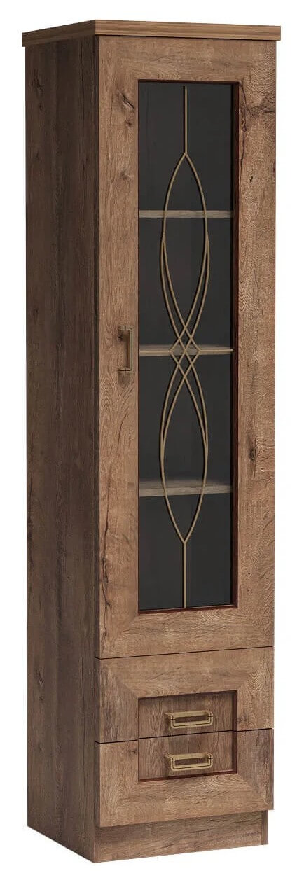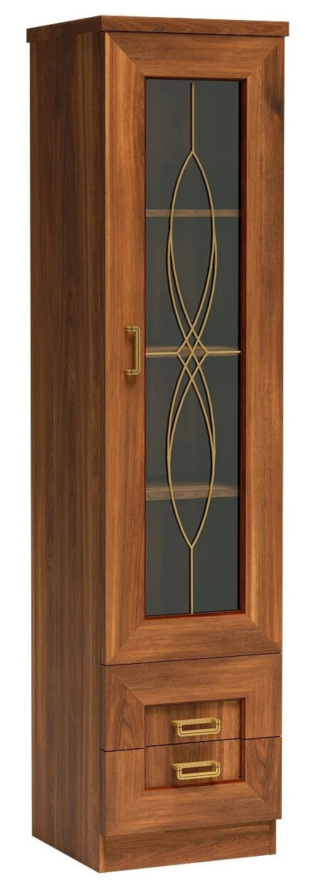 Witryna jednodrzwiowa z szykownymi szprosami na szklanych frontach. W środku trzy półki na których możemy wyeksponować nasze drogocenne rzeczy, takie jak biżuteria i wyszukana zastawa na stół. Na dole dwie szuflady na np. obrusy. Dostępna w dwóch wybarwieniach.