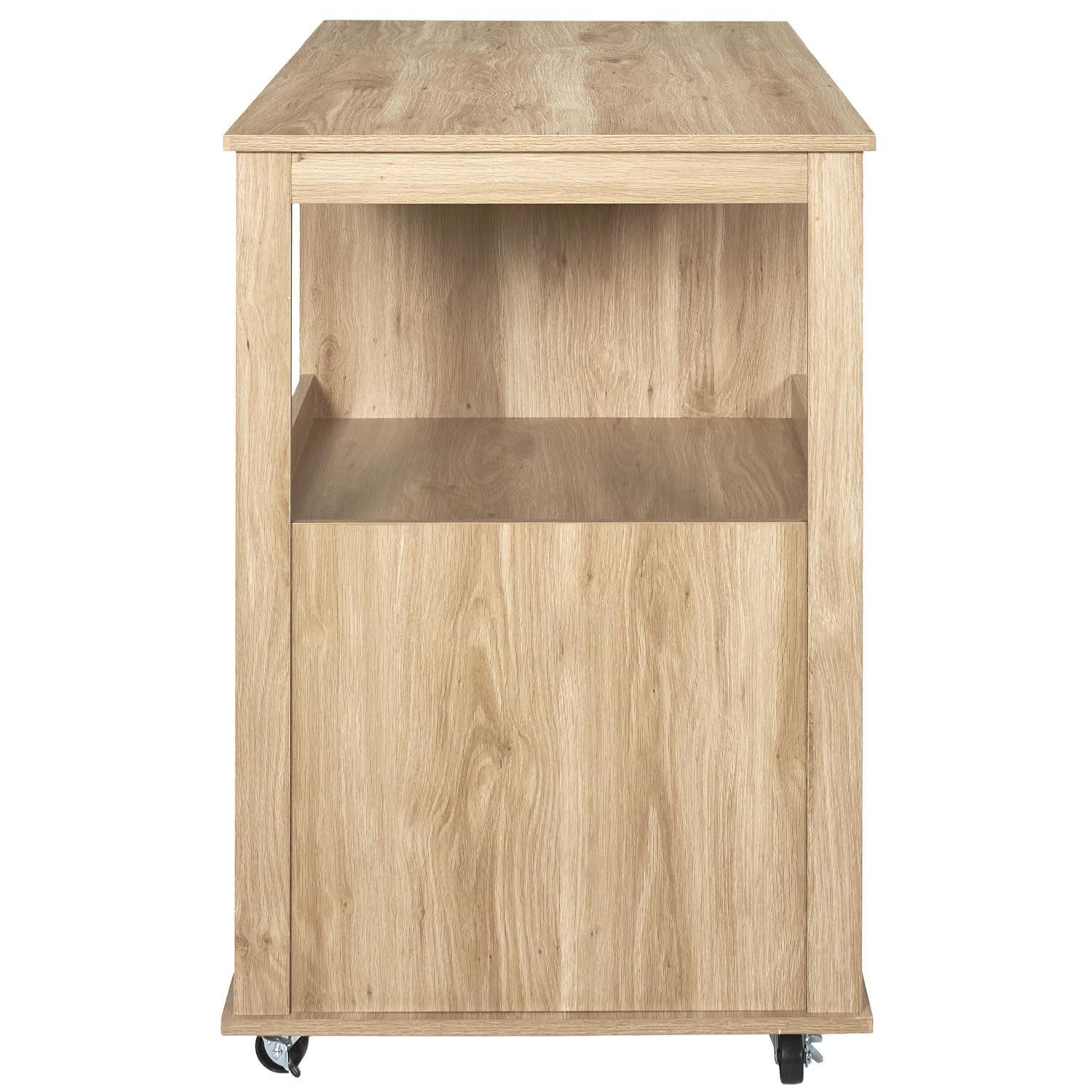 Wyspa kuchenna z serii Klaus to ciekawe rozwiązanie do niedużych mieszkań z aneksem kuchennym. Wyspa wyposażona jest w 4 nóżki z tworzywa sztucznego, dzięki czemu możemy ją przesuwać i umieszczać w miejscach, gdzie jej najbardziej w danym momencie potrzebujemy. Wyspa zawiera wiele półek na przyprawy, miejsce na wino, szufladę, a cała jej konstrukcja to modne lamele i blat w kolorze dębu naturalnego.