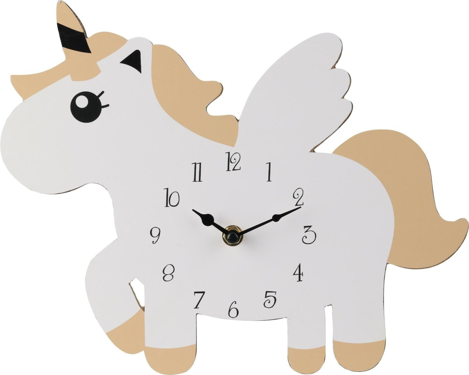 Zegarek naścienny w kształcie jednorożca. Działa na jedną baterię AA (brak w zestawie). Do pokoju dziecięcego lub np sali przedszkolnej. Materiał MDF.