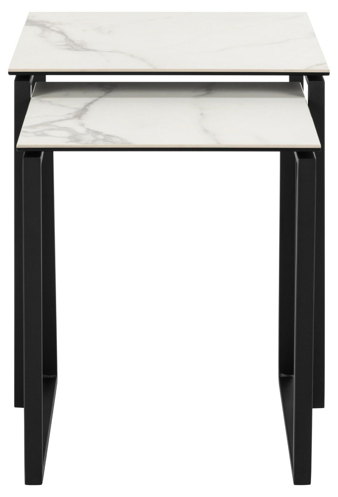 Prezentujemy przyciągający wzrok zestaw stolików kawowych, który powstał z połączenia geometrii, kontrastu i materiałów. Kwadratowy blat ma białą ceramiczną powierzchnię imitującą marmur, dzięki czemu stoliki są łatwe do czyszczenia, a także odporne na ciepło i zarysowania. Uzupełniony o czarną stalową podstawę, jest dobrze wyważonym projektem, który przyciąga uwagę. Kwadratowy stolik kawowy Katrine, blat z białej eramiki Akranes, podstawa z matowej czarnej szorstkiej stali malowanej proszkowo. Zestaw składa się z dwóch stolików: duży 50x50cm i wyskość 55cm, mały stolik 43x43cm i wysokość 50cm Max. obciążenie 20kg Waga stolików: 15,9kg