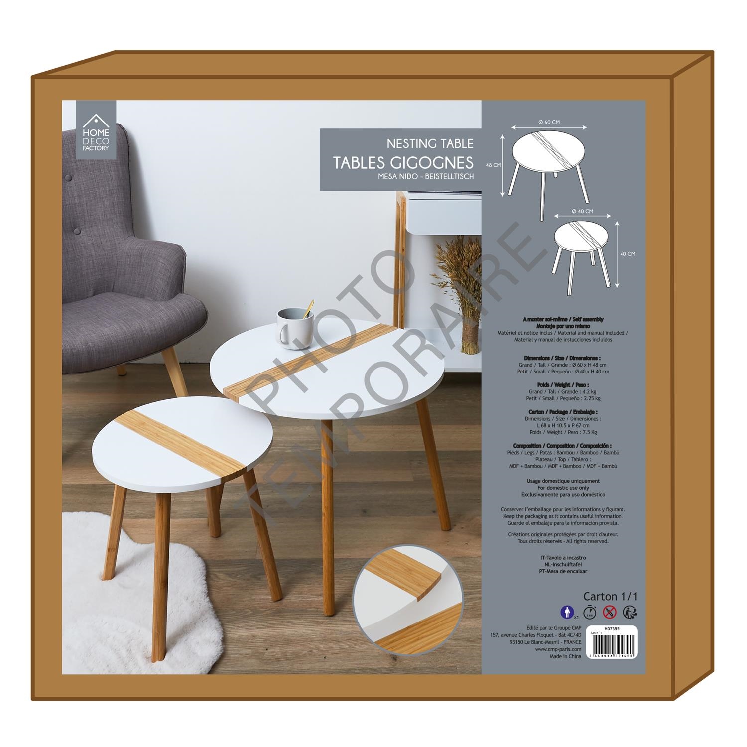 Zestaw 2 stolików Paraiba to świetny sposób na zorganizowanie przestrzeni w salonie. Pokochasz ich dwukolorowy blat z ciekawym połączeniem nie tylko kolorów ale również tekstur. Biały blat o okragłym kształcie ozdobiony został wstawką z frezowanej płyty w kolorze naturalnego drewna. Nogi stolika to bambus w naturalnym kolorze zabezpieczony lakierem. Zestaw składa się z dwóch stolików o wymiarach: duży: wysokość 48cm, średnica 60cm mały wysokość 40cm, średnica 40cm Stoliki wymagają montażu Max. obciążenie na jeden stolik 15kg. Materiały: blat: płyta MDF, nogi: bambus