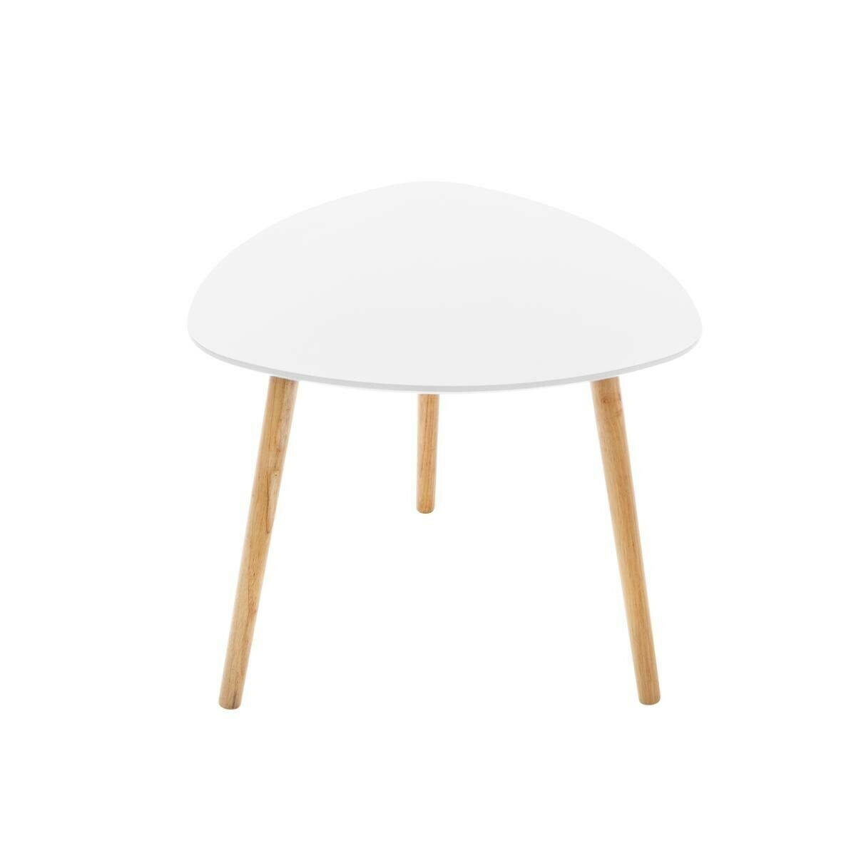 Zestaw trzech stolików w stylu skandynawskim z białymi blatami i drewnianymi dębowymi nogami sprawdzą się jako stoliki przy sofie lub jako stoliki pomocnicze. Blat stolików to wytrzymała na odparzenia i uderzenia płyta MDF. Płyta w okleinie o białym kolorze jest łatwa w czyszczeniu. Dębowe, lekko roszerzające się nogi stolików dodają im naturalnego wyglądu. Zestaw skłąda się z trzech stolików o różnych wielkościach. Największy stolik o wysokości 45cm, szerokości 60cm, i głębokości 60cm pozwoli na schowanie pod nim mniejszych stolików o wymiarach: średni o wysokości 40cm szerokości i głębokoś