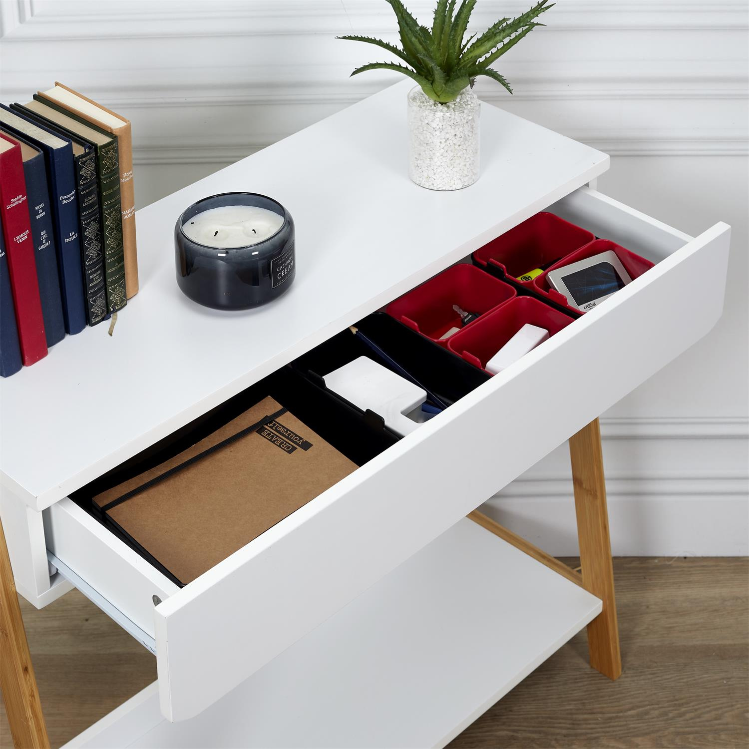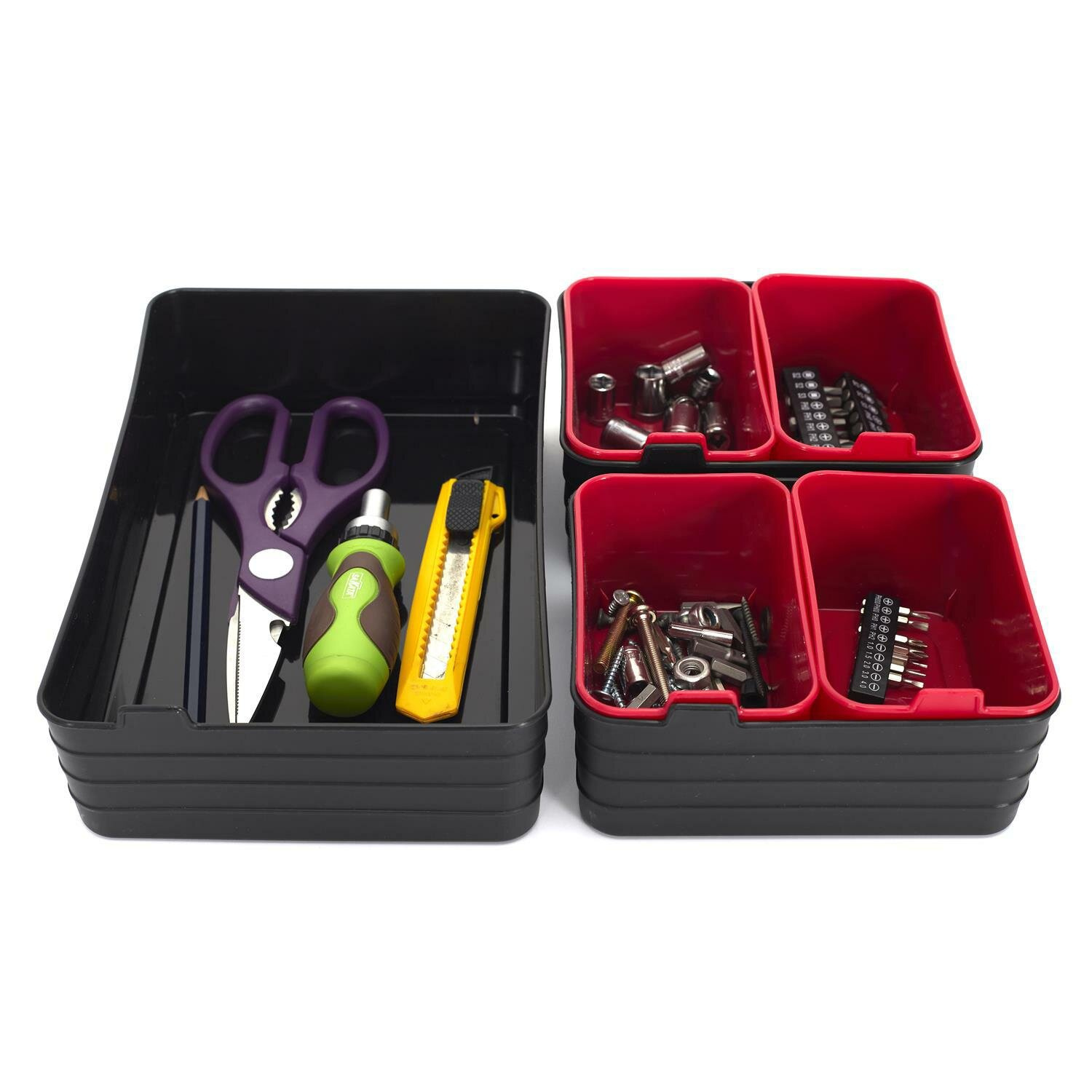 Zestaw organizerów do szuflad lub organizerów do warsztatu. Zestaw zawiera 7 organizerów z tworzywa sztucznego w dwóch kolorach. Pomoga one zorganizować przestrzeń i utrzymać porządek w szufladach lub szafkach. Materiał: polipropylen