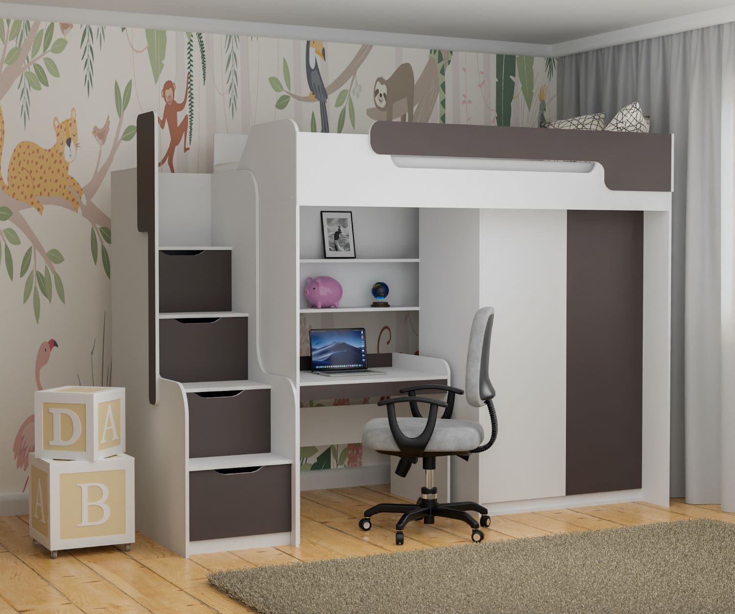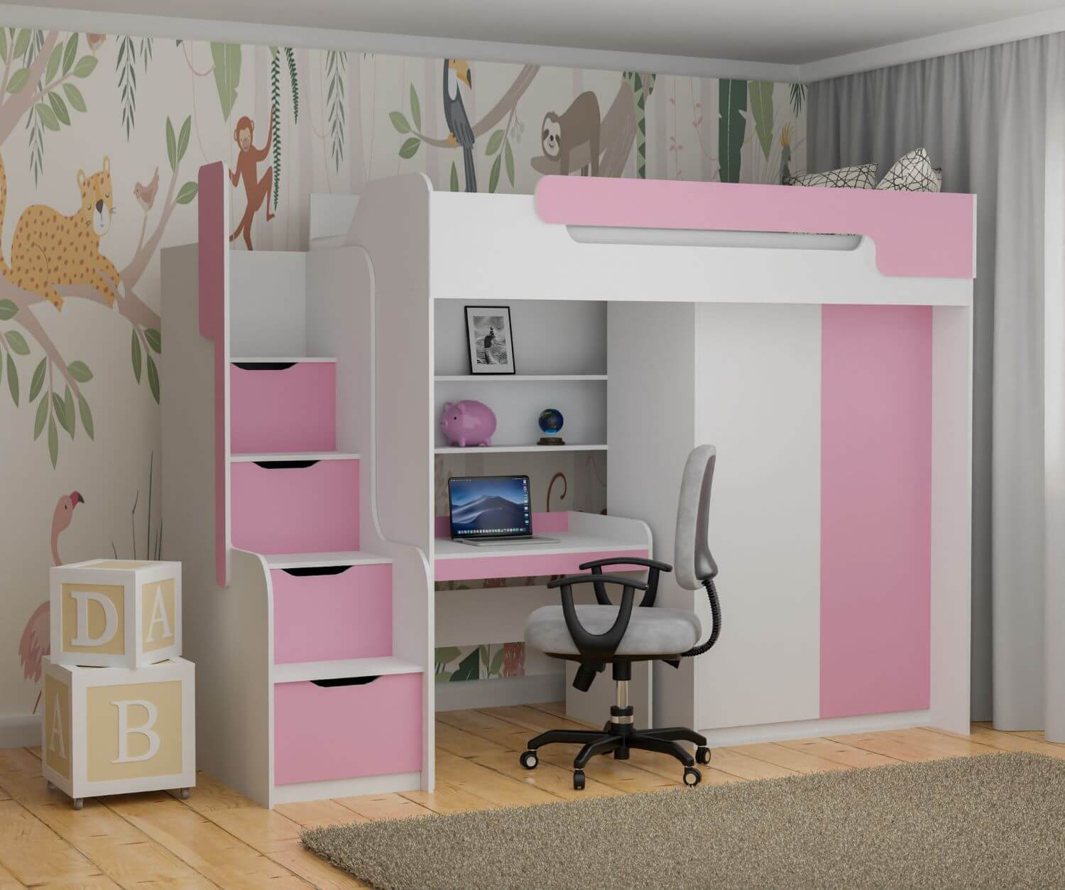 DORIAN – podstawą tego programu jest jednosobowe łóżko piętrowe pod materac 90/200, w którym zamiast standardowej drabinki zastosowano schody. Umieszczenie zamykanych półek w stopniach schodów łóżka spowodowało że schody pełnią funkcję regału, dzięki temu model ten jest jeszcze bardziej atrakcyjny poprzez stworzenie dodatkowej powierzchni do przechowywania. Schody do wchodzenia można ustawić po prawej jak i po lewej stronie. Projektant tworząc ten program daje możliwość umieszczenia pod łóżkiem dodatkowych brył: szafy, biurka oraz łóżka parterowego pod materac 90/200. Program Dorian występuje w kolorze białym (kolor podstawowy – brak możliwości zmiany) w połączeniu do wyboru z kolorem niebieskim, zielonym, pomarańczowym, popielem oraz różanym. Materac nie występuje w komplecie z łóżkiem, należy domówić go oddzielnie.