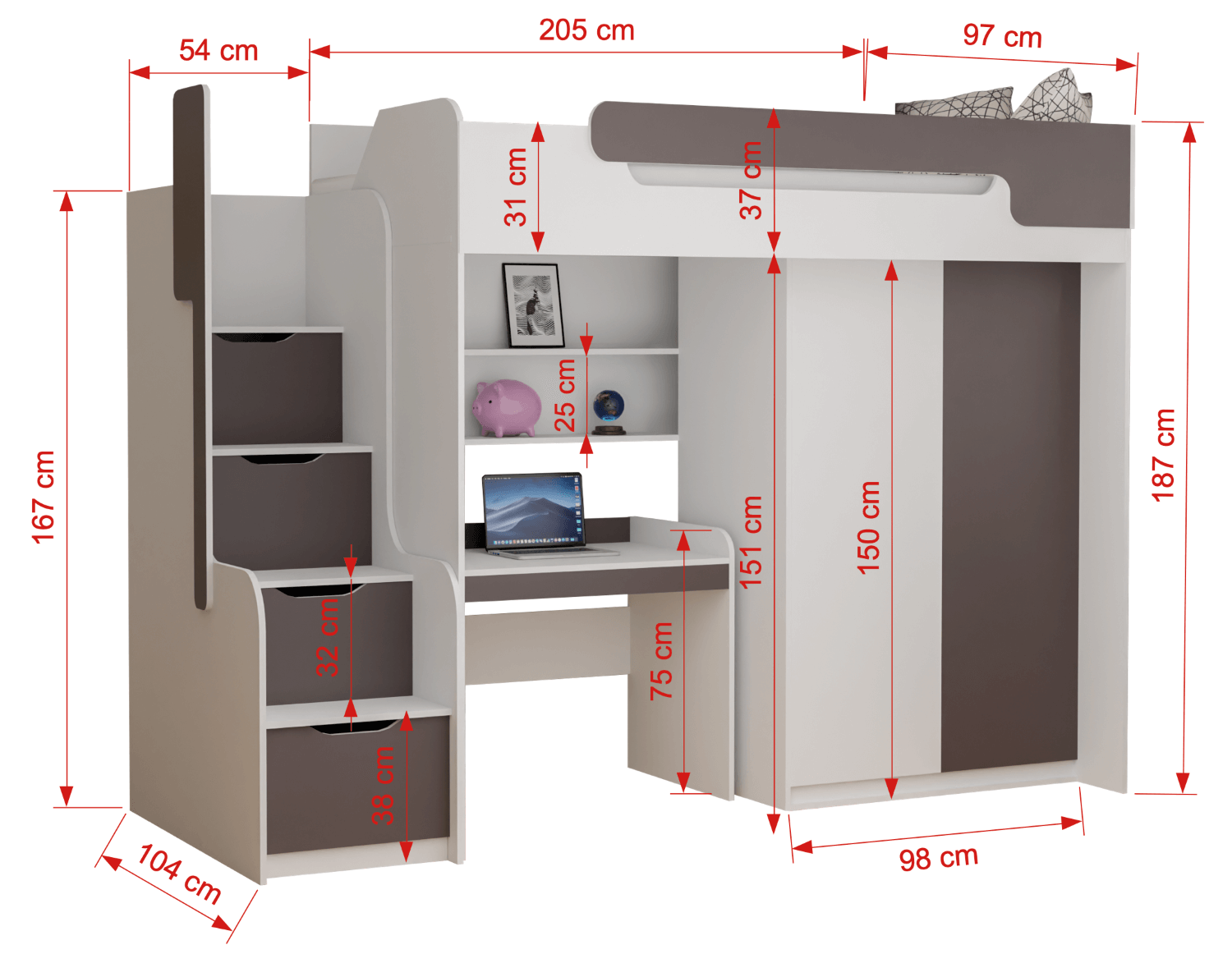 | Wymiary zewnętrzne łóżka razem ze schodkami (dł./szer./wys.) | 259/104/187 cm |