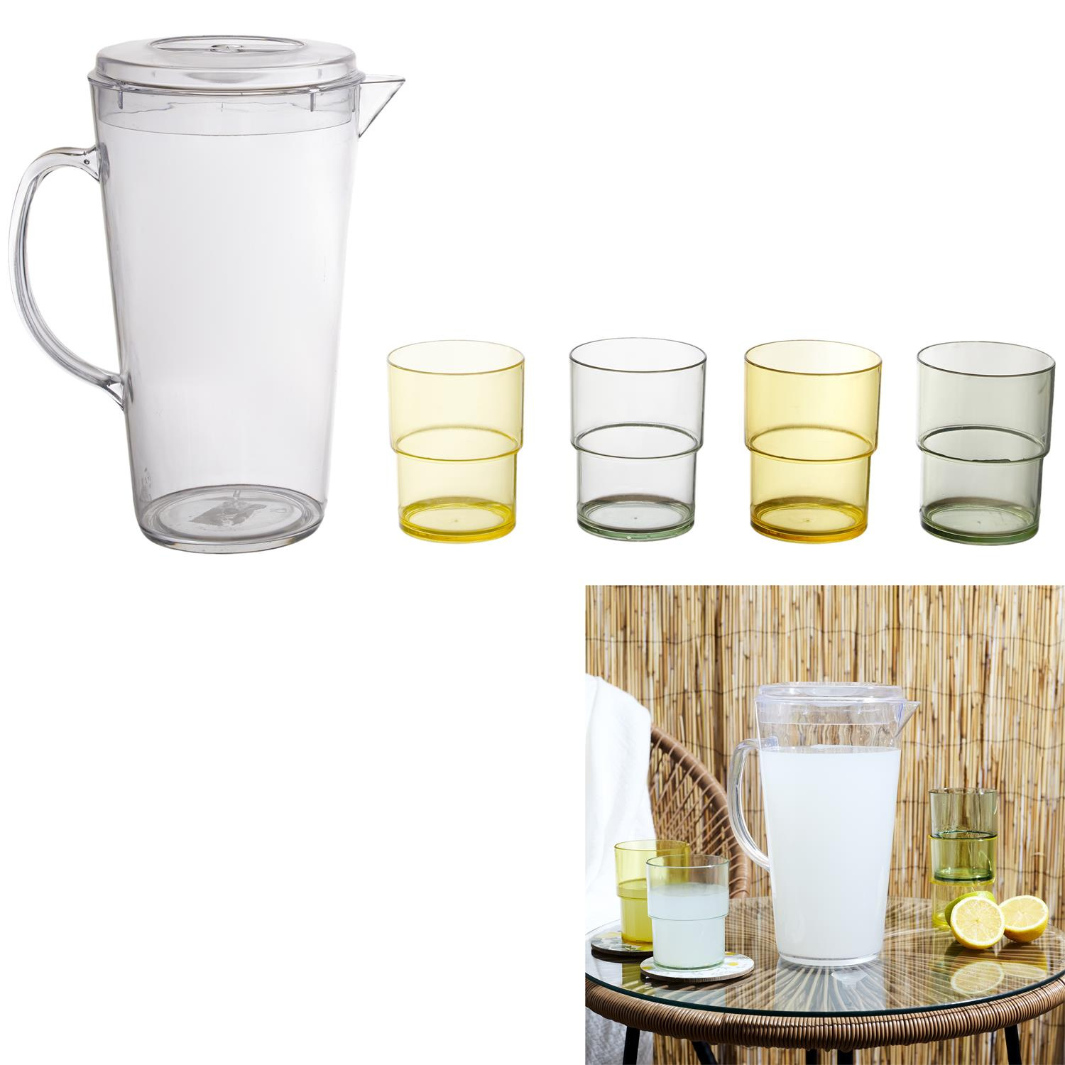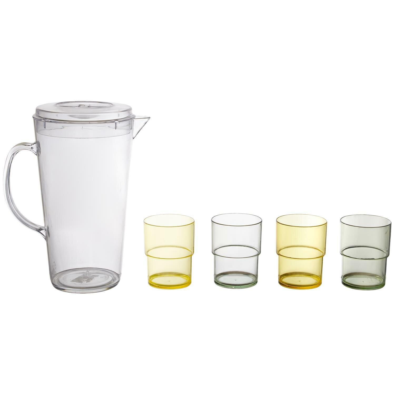 Zestaw dzbanek i 4 szklanki z tworzywa sztucznego to idealny dodatek i sposób podania napojów podczas pikniku, kempingu lub imprezy w plenerze. Zestaw składa się z pojemnego dzbanka i 4 kolorowych szklanek. Budowa szklanek pozwala na sprytne schowanie ich w środku dzbanka. Taka funkcja jest przydatna podczas transportu np. na wycieczkę rowerową.