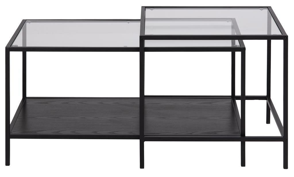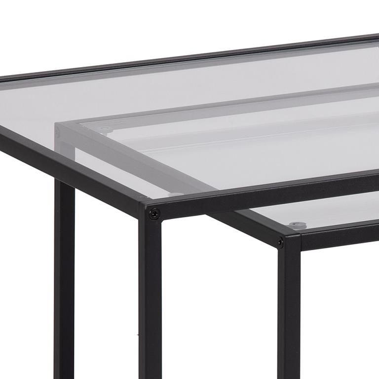 Zestaw stolików kawowych Seaford to meble w stylu industrialnym idealne do nowoczesneo salonu bądź poczekalni. Szkielety stolików wykonane są z malowanego proszkowo metalu w kolorze czarnym. Ich blaty wykonane są z lekko dymionego szkła. Wyższy stolik posiada blat w kształcie kwadratu, zaś niższy w kształcie prostokątu. Stolik prostokątny posiada dodatkowo szeroką półkę z płyty MDF w czarnej okleinie. Nogi stolików są od spodu zabezpieczone specjalnymi nakładkami. Stoliki można z powodzeniem ustawić razem bądź używać ich osobno. Wymiary stolików: 55x55x50cm, 90x50x45cm Ilość kartonów: 1 Wymiary kartonów: 93,5×57,5×10,5cm Waga kartonów: 20,1kg