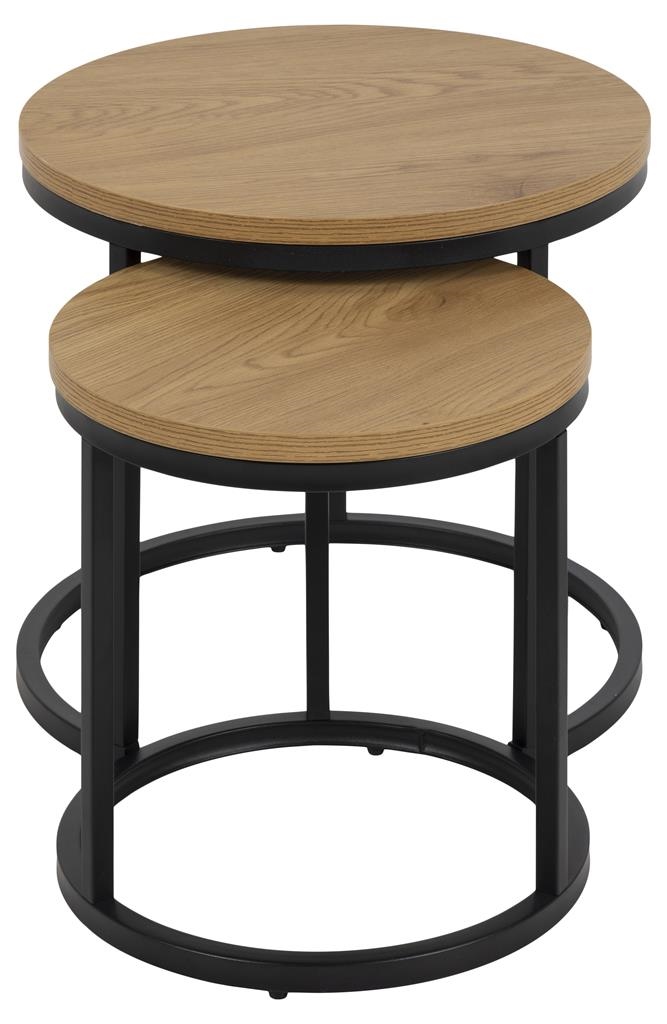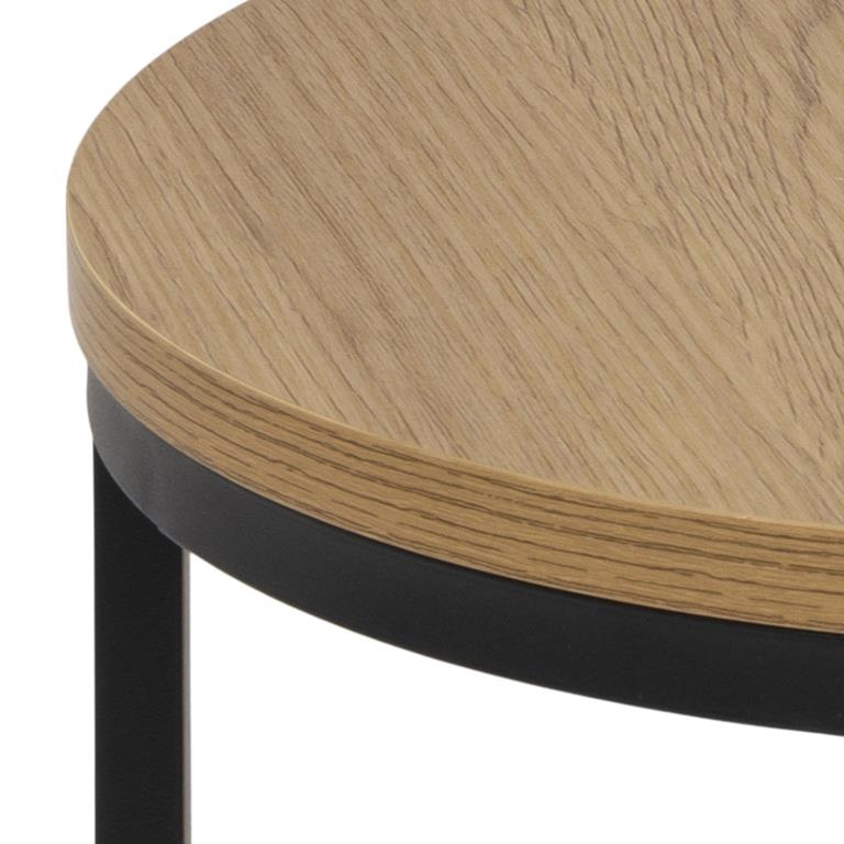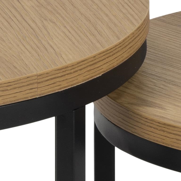 Nowoczesny komplet dwóch okrągłych stolików kawowych, których niewątpliwą zaletą jest możliwość schowania mniejszego pod większy. Okrągłe blaty stolików zostały zrobione z laminowanej płyty MDF. Laminat o wzorze oraz kolorze naturalnego dębu ciekawie współgra z czarną metalową podstawą stolików. Okrągłe stoliki posiadają wytrzymałą i stabilną podstawę wykonaną z metalu malowanego proszkowo. Zestaw stolików Spiro to idealne stoliki kawowe do salonu lub poczekalni. Stoliki w stylu nowoczesnym odnajdą się w każdym wnętrzu i będą jego ozdobą. Ilośc kartonów: 1 Wymiary kartonów: 49,5x47x9cm Waga kartonów: 5,5kg