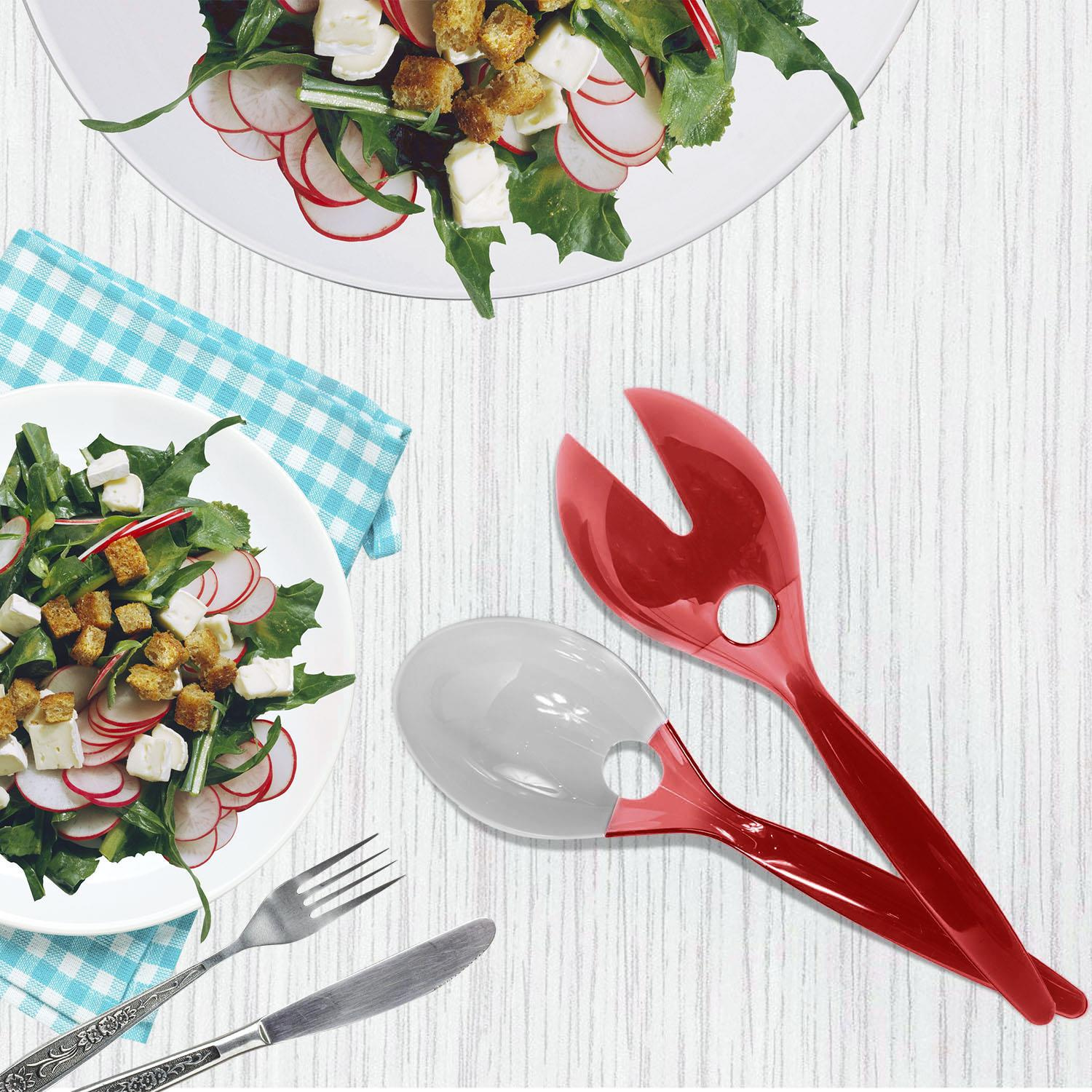 Zestaw 2 łyżek do sałatek to idealny zestaw, któy pozwoli na łatwe nałożenie sałaty. Zestaw wykonany z łatwego w czyszczeniu tworzywa sztucznego. Ciekawy kolor łyżek doda nowoczesnego wyglądu podczas serowania dań. Można myć w zmywarce